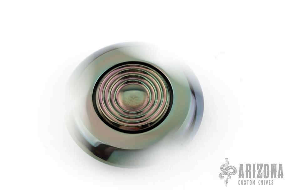 This is an "oil slick" finished zirconium spinner by Yellowday Energy, and it is in excellent condition.