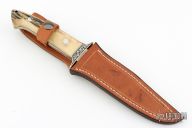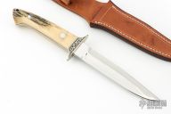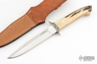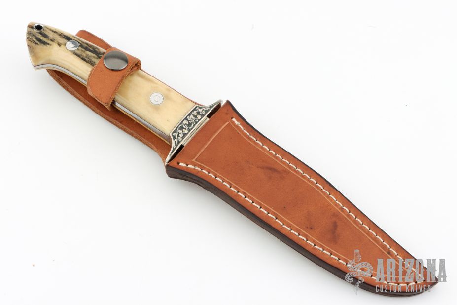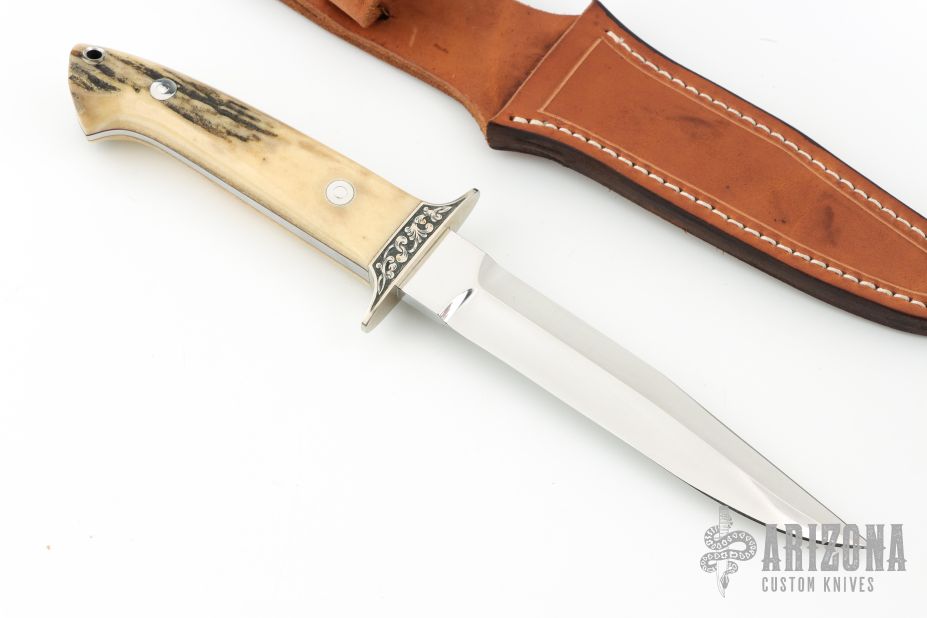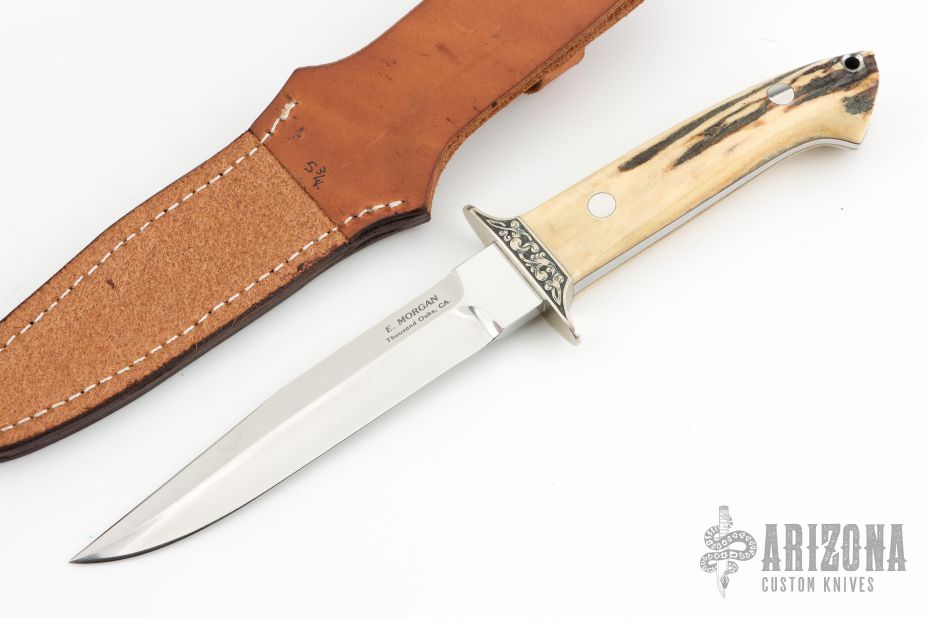 This Fighting Knife was made by Emil Morgan of Thousand Oaks, CA.  It is a tribute to a Loveless-style Fighter.  It features a mirror polished blade made of ATS-34 stainless steel, with just under 3 of the spine having been sharpened from the tip.  The handle is two (2) nicely matched and thick stag scales with stainless steel pins.  The handle measures just over 1.0 in thickness at the widest part.  A full tapered tang sandwiched between dark red liners, adds to the solid construction and helps reduce weight.  There is also a stainless steel lined lanyard hole.  The double guard has been tastefully engraved on both sides.  The artist did not sign the engraving, so I am assuming that it was done by Emil.  The knife comes with a handmade leather belt sheath with retention strap, also presumably crafted by Emil.  It has never been used, carried or sharpened.  Also includes a padded zippered case. Has a couple very light scratches, otherwise excellent condition.