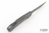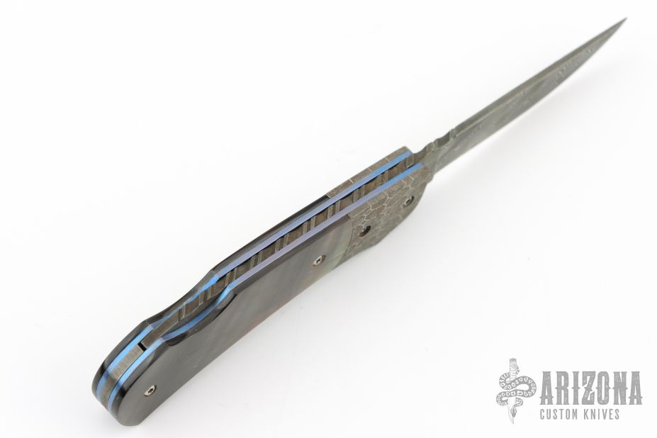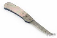 This Lockback by Ralph Turnbull features a Damascus blade with nail nick and fileworked spine. The handle has Mosaic Damascus bolsters, black lip pearl scales, anodized titanium liners, fileworked Damascus backspacer. Nice lockup and blade seating. Excellent condition. Comes with a zippered case and makers card.