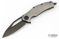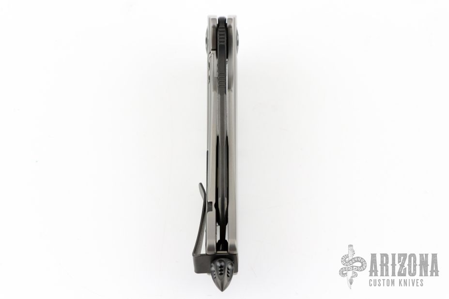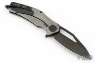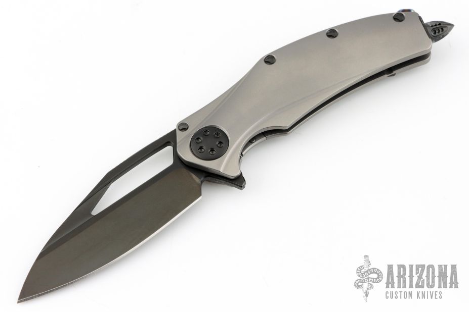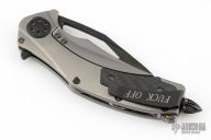 This Matrix-R by Marfione Custom Knives features a DLC two-tone stonewash blade with notched thumbrest and flipper. The handle has a double vapor blast finished titanium frame with black "Fuck Off" tip up clip and flamed titanium backspacer.  DLC hardware. Includes the original box, zipper case and papers. Trit in the tail. 03/2022. Excellent Condition.  This knife is 1 of 4 made. This was confirmed by the man himself, Tony Marfione!
