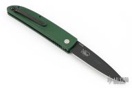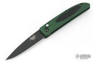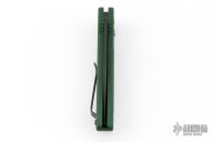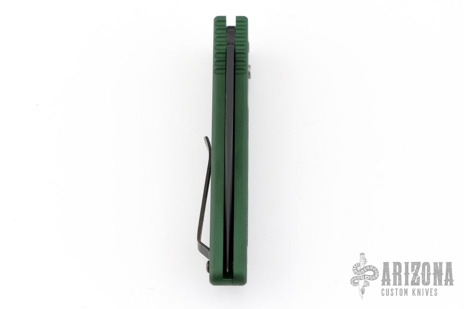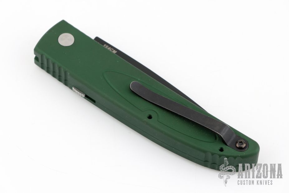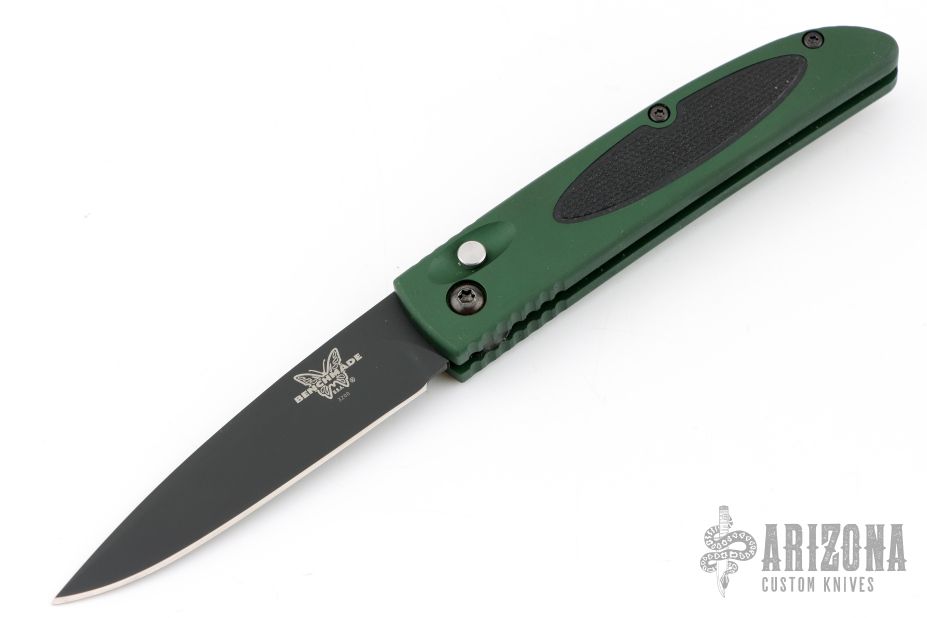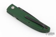 This Mel Pardue 3200 Auto has a black drop point blade. Handle is green anodized aluminum with A-side G10 overlay, safety on handle spine, and black stainless steel tip up clip. Great action and lockup. Excellent condition. Comes with original box and papers. Discontinued. Marked 07/25 on the blade.