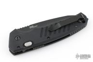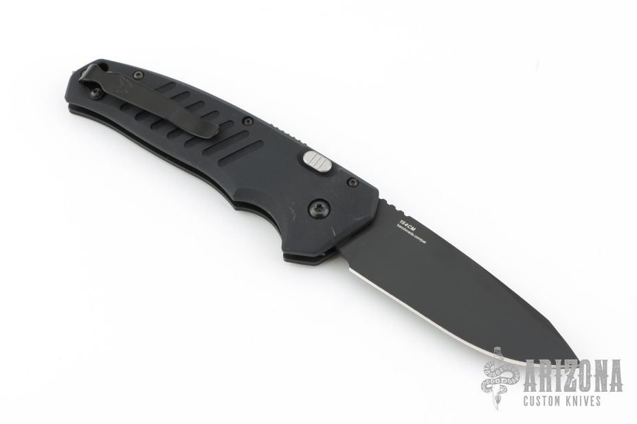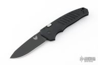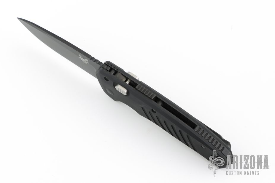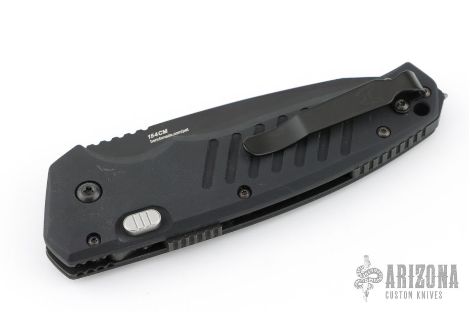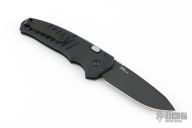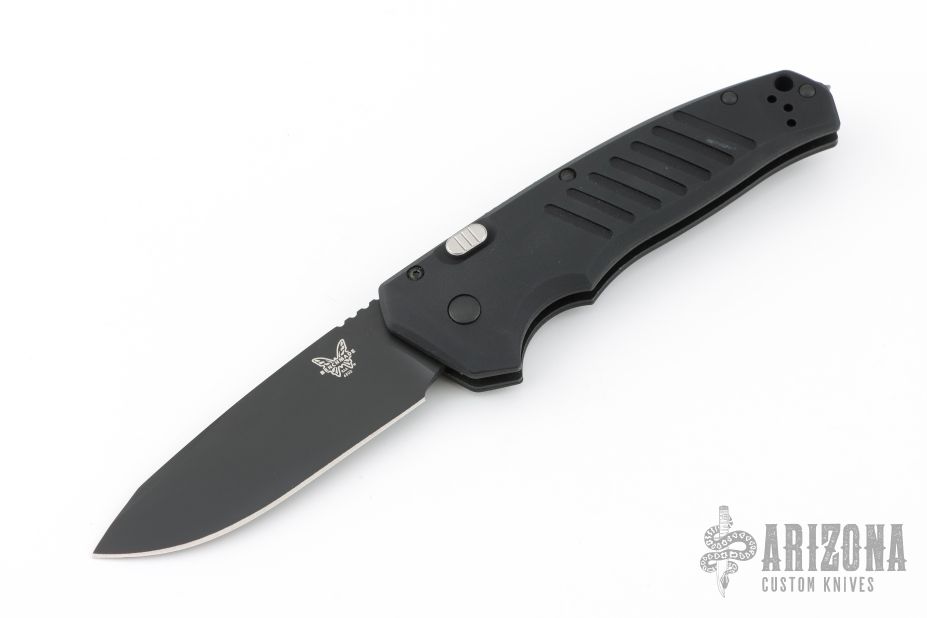 This Auto APB from Benchmade features a black coated drop point blade with notched thumb rest. The handles are comprised of black billet aluminum handles over steel liners and backspacer. Lanyard hole and glass breaker on pommel. This knife features a unique action in which buttons to activate the auto opening are placed on both sides of the knife for a truly ambidexterous action. Stainless steel tip up clip, left or right reversible. Includes drawstring pouch and original packaging. Has a couple light scuffs, otherwise excellent condition.