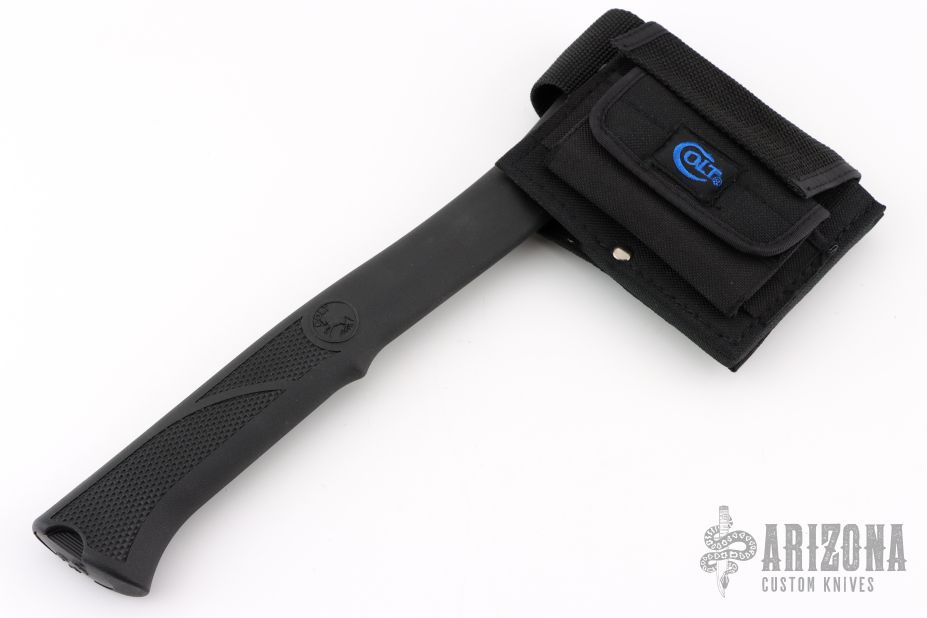 COLT CT2 TRAILBLAZER AXE KNIFE COMBO WITH SHEATH. The axe is 12 1/2" long over all with a about a 3" cutting edge and an 8" fixed blade knife locks in to the handle. The axe is marked "COLT" on both sides of the handle by the head. The word "COLT" is above the pony on the handle. The knife is marked "COLT TM" and "CT2 STAINLESS STEEL". The blade is about 4" long. The black plastic handle has a brass button that holds the knife into the axe handle when not in use. The black nylon sheath has a belt loop storage pouch and "COLT" in blue on the front.