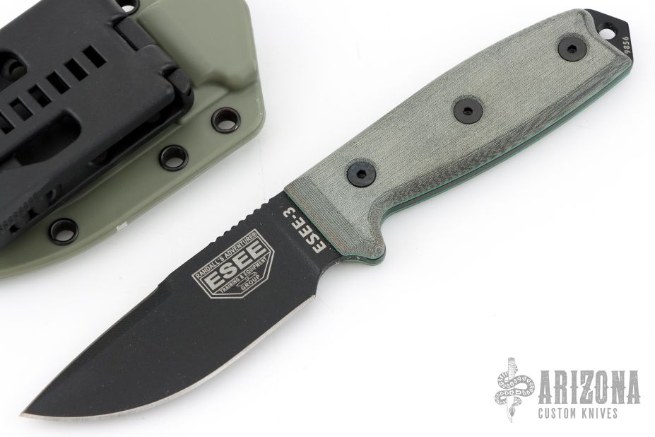 This fixed blade by Esee Knives features a black coated and textured drop point blade with notched thumb rest. .132" blade stock and 1.232" blade depth. Scales are black linen micarta, with (almost seafoam) green liners. Lanyard bail or skull crusher at but. Numbered 9856. Comes with kydex sheath. Has some scuffs, excellent condition otherwise.