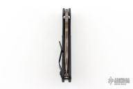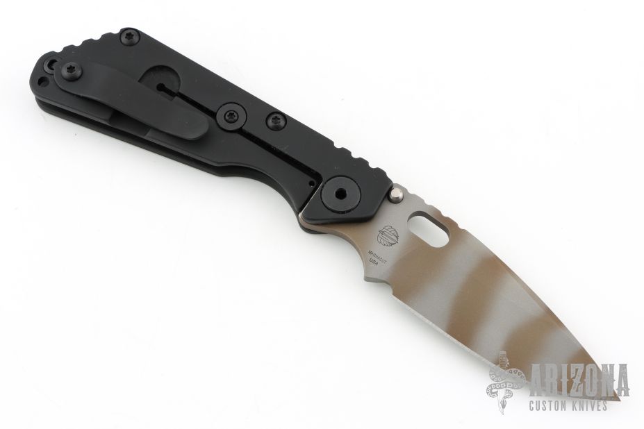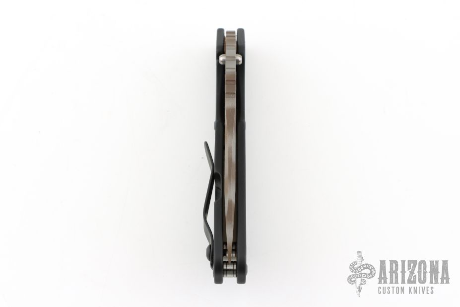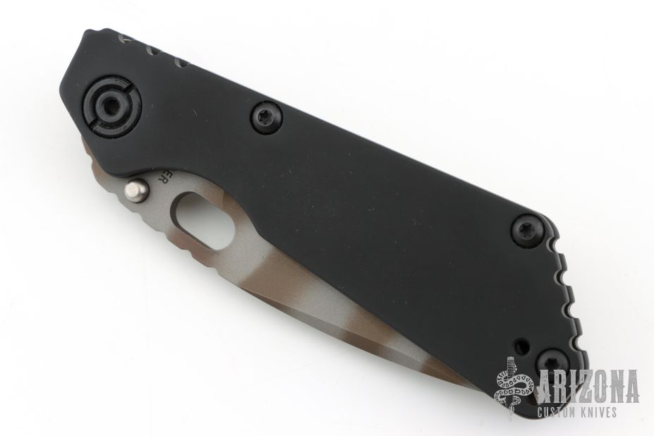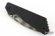 This Mick Strider Performance series SNG framelock folder features a Ghost Striped finished blade with thumbhole and notched thumbrest. The handle has a black DLC titanium frame with titanium clip, tip up carry. Jimping on blade spine. Includes Hinderer "Lock Bar Stabilizer" for maximum reverse lock retention. Excellent lockup, detent, and blade seating. New Condition.