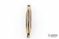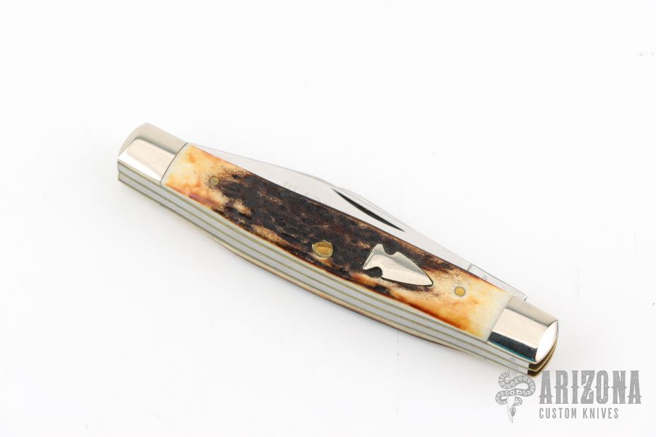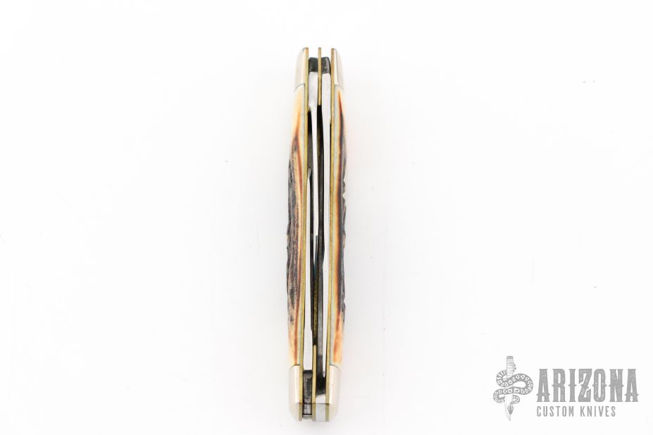 This Northwoods Knives Medium Stockman features 3 mirror polished blades with nail nicks. The handle has nickel silver bolsters and cap, stag covers with nickel silver arrow head escutcheon, brass liners and stainless steel springs. Excellent condition. Comes with original box. #49 of 50