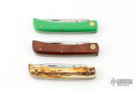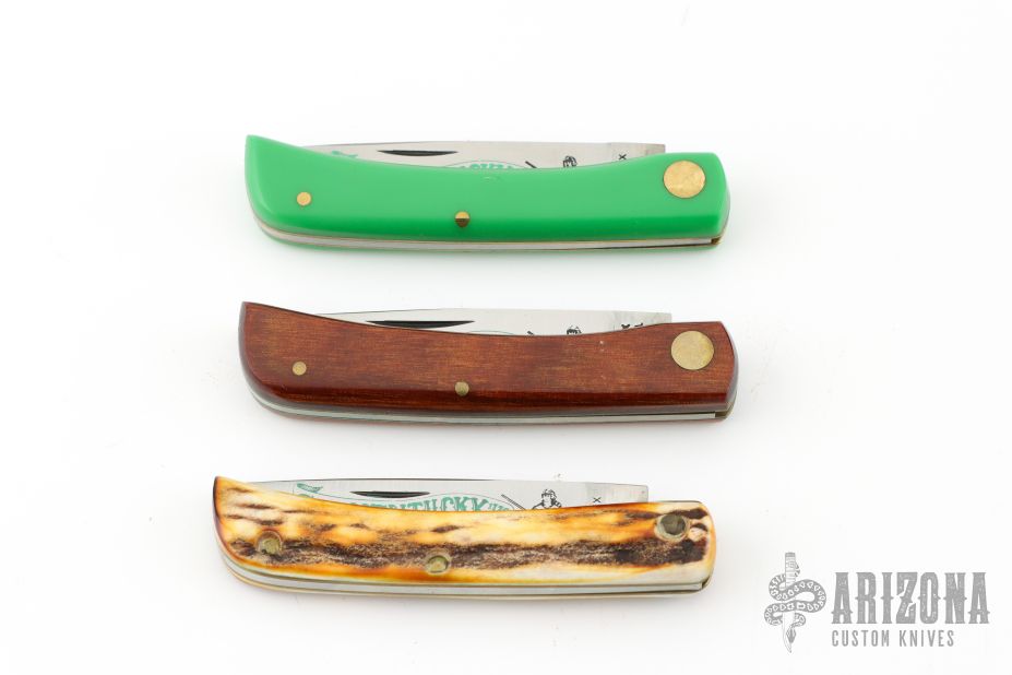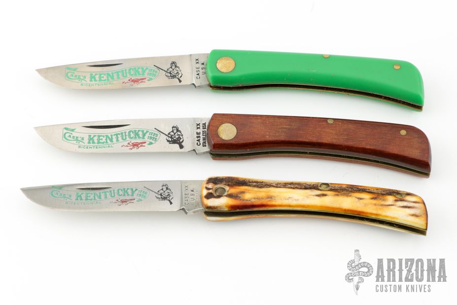 Set Of 3 Vintage Case XX USA KENTUCKY BICENTENNIAL Knifes with original boxes. One with Stag, one with wood, one with green scales. All in excellent condition.