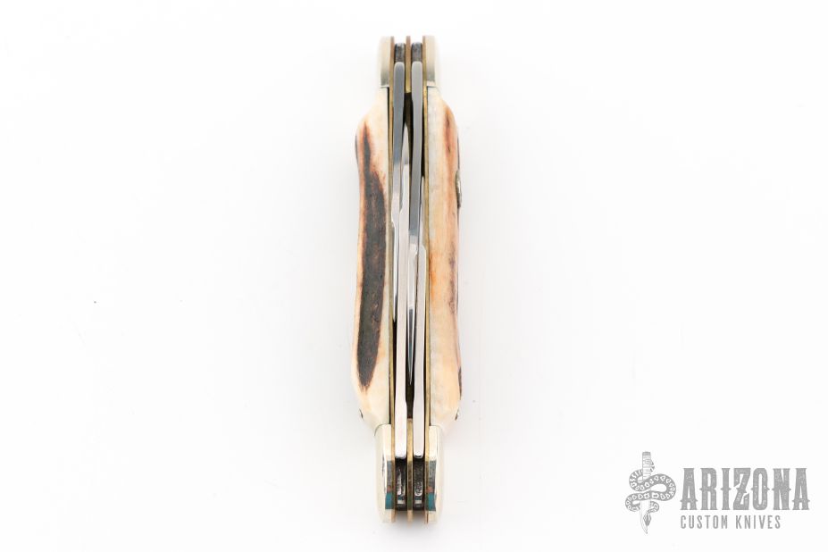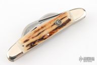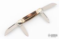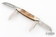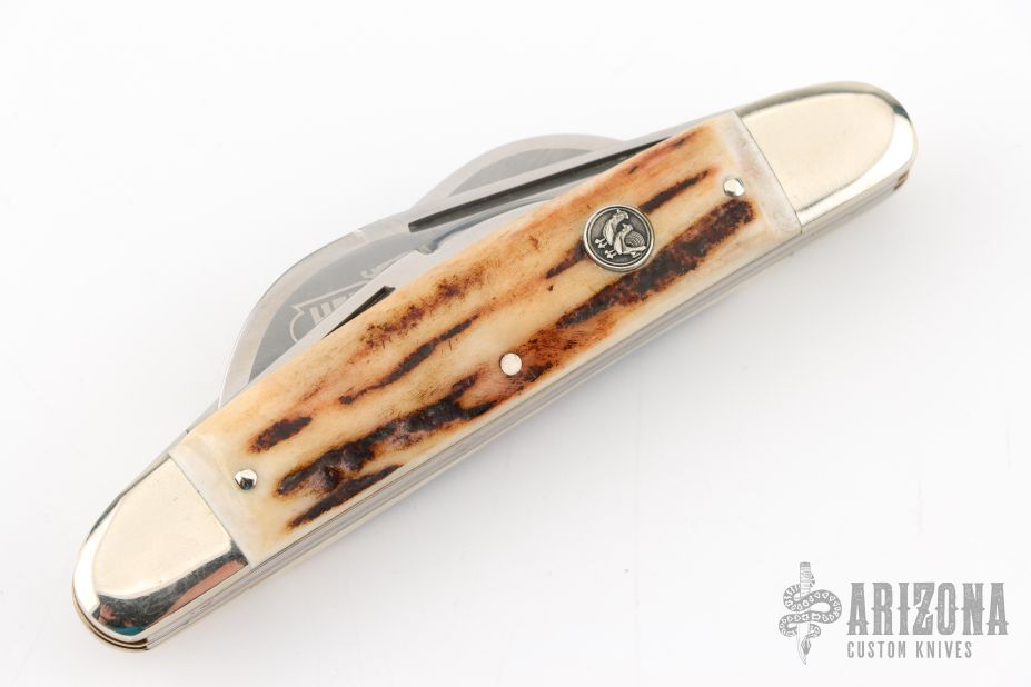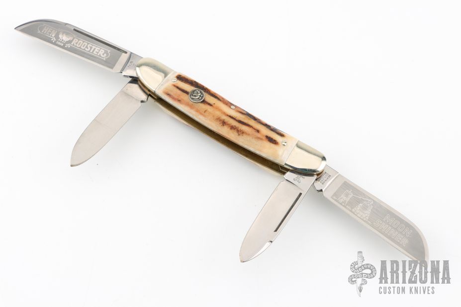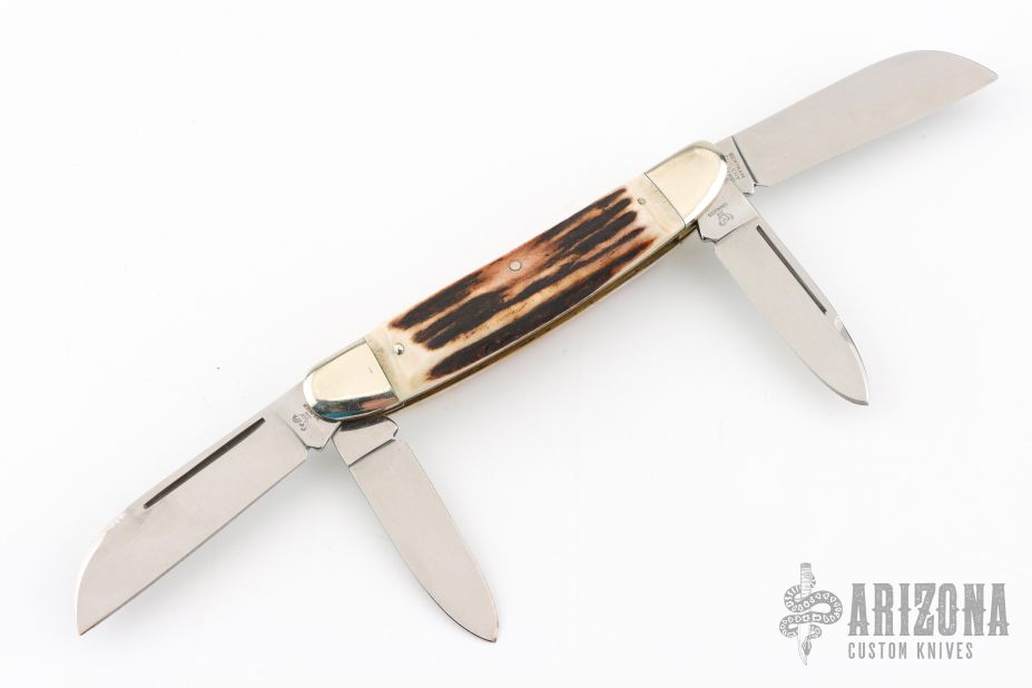 This 4-blade congress by Hen and Rooster features 4 mirror polished blades with nail nicks. The handle has nickel silver bolsters, front and rear, stag covers, brass liners, stainless steel springs. All blades have half stops. Has a few light scratches, otherwise excellent condition. Comes with a zippered case.