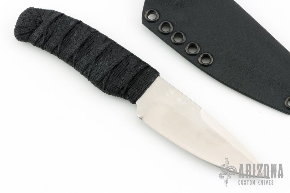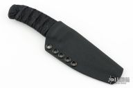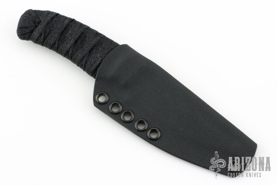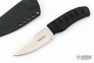 This Spearpoint by Bantang Knives features a satin finished spear point blade with false top edge, .124" blade stock and 1.173" blade depth, hidden tang construction. The handle has black cord wrap over black cord. Comes with a kydex sheath. Excellent condition.