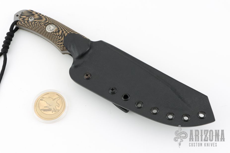 This Night Fighter by Steve Woods and Nighthawk Custom features a bead blasted blade with a fuller on one side, .204" black stock and 1.597" blade depth, full tang construction. The handle has black/tan G-10 scales. Comes with a kydex sheath, challenge coin and COA. Excellent condition.