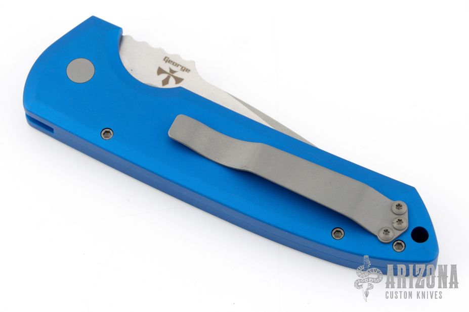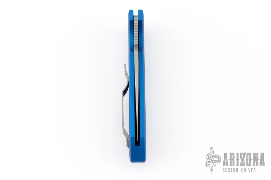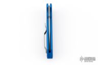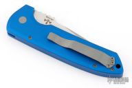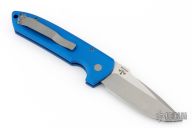 This LG301 Rockeye has a stonewashed blade with satin flats and notched thumbrest. The handle has a blue aluminum frame with a steel tip up pocket clip and a push button. Typical flawless Pro-tech mechanics and blade seating. Comes with original box and papers. Excellent condition.