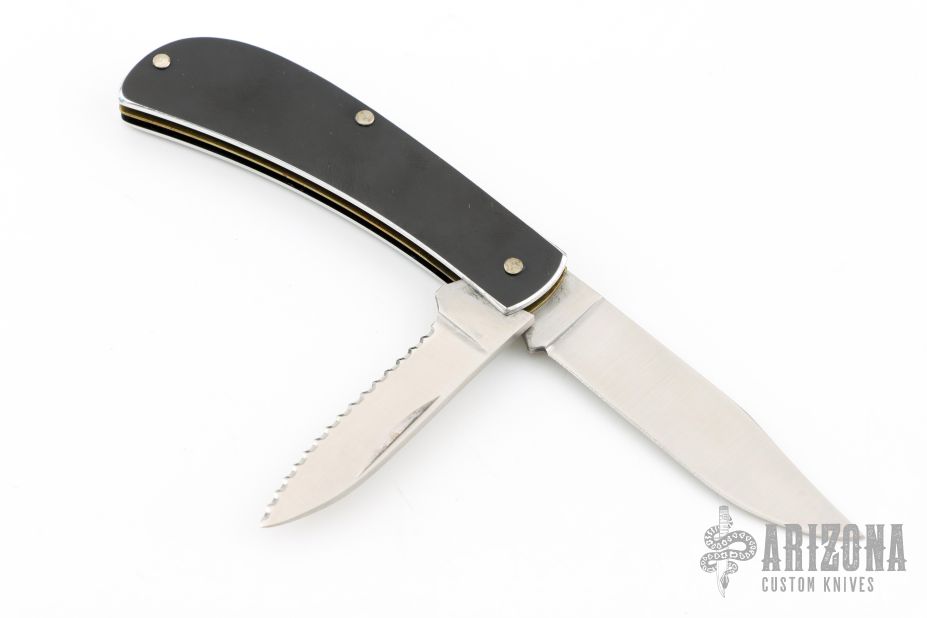 This slipjoint by Cutco features satin finished blades with nail nicks, one blade is fully serrated. The handle has black aluminum covers, brass center liner, stainless steel springs. Has a couple light scratches, otherwise excellent condition. Comes with original brown leather sheath.