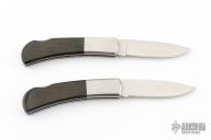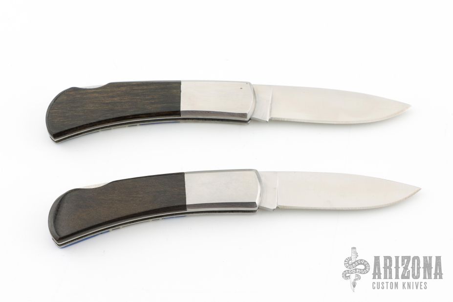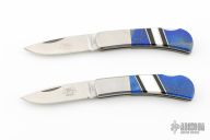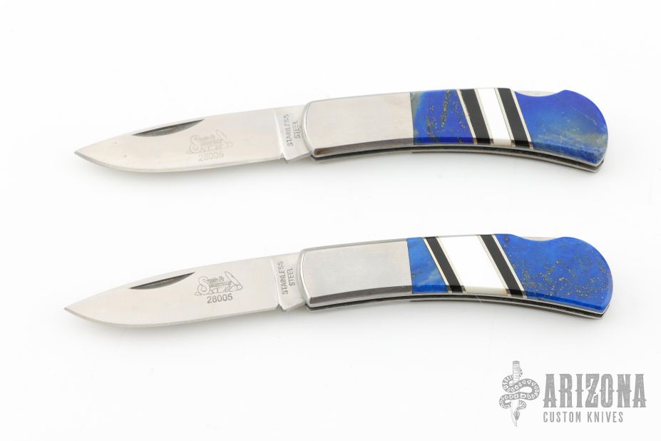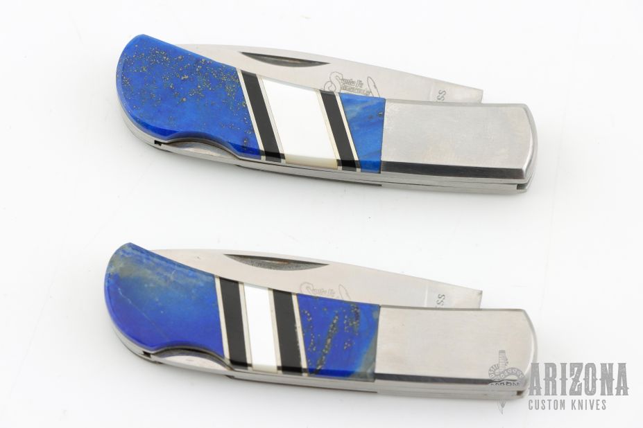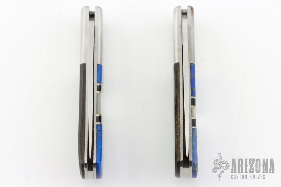 This Lockback by Santa Fe Stoneworks features a satin finished blades with nail nicks. The handles have nickel silver bolsters, Lapis and mother of pearl inlays, black and stainless spacers, stainless steel liners, stainless steel backspacer. Has a couple light scratches, otherwise excellent condition. Comes with original boxes.