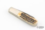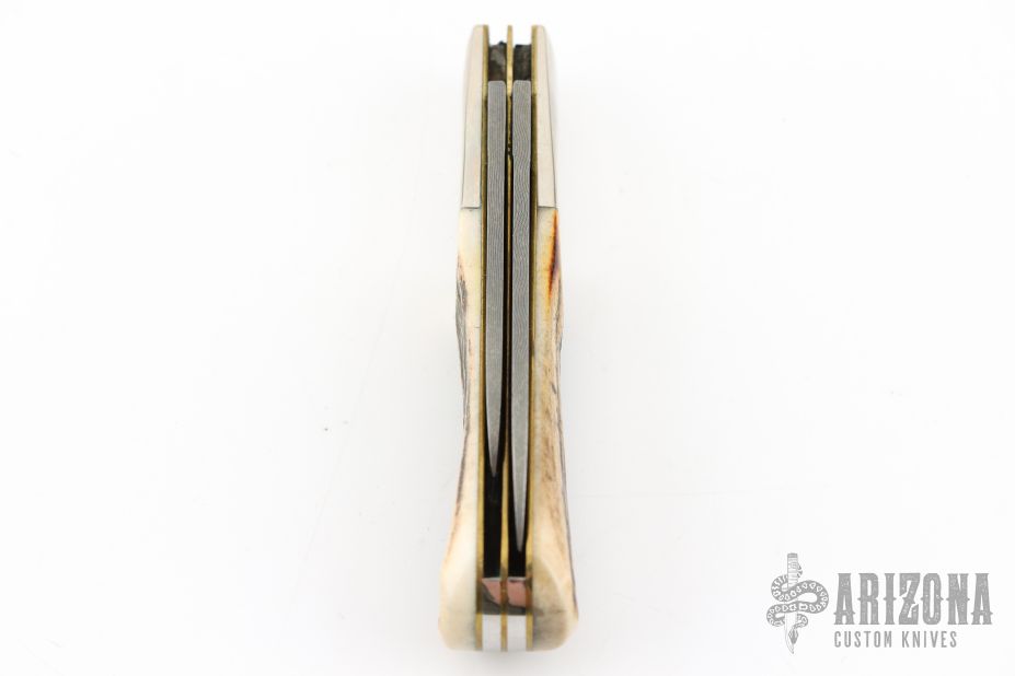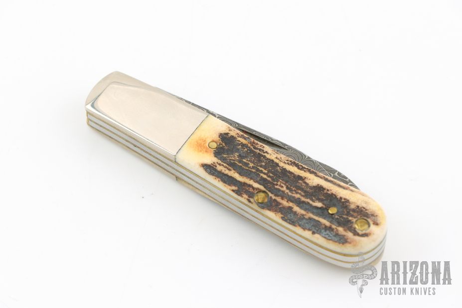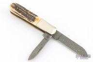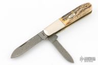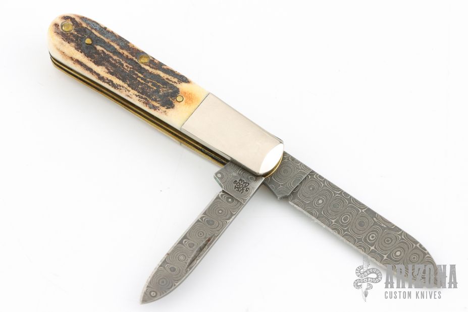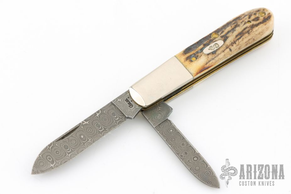 This two blade Barlow by Case features two Damascus blades both with nail nicks. The handle has stag covers, nickel silver bolsters, brass liners and stainless steel springs. Has half-stops. Excellent condition. Comes with original box and papers.