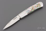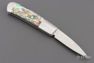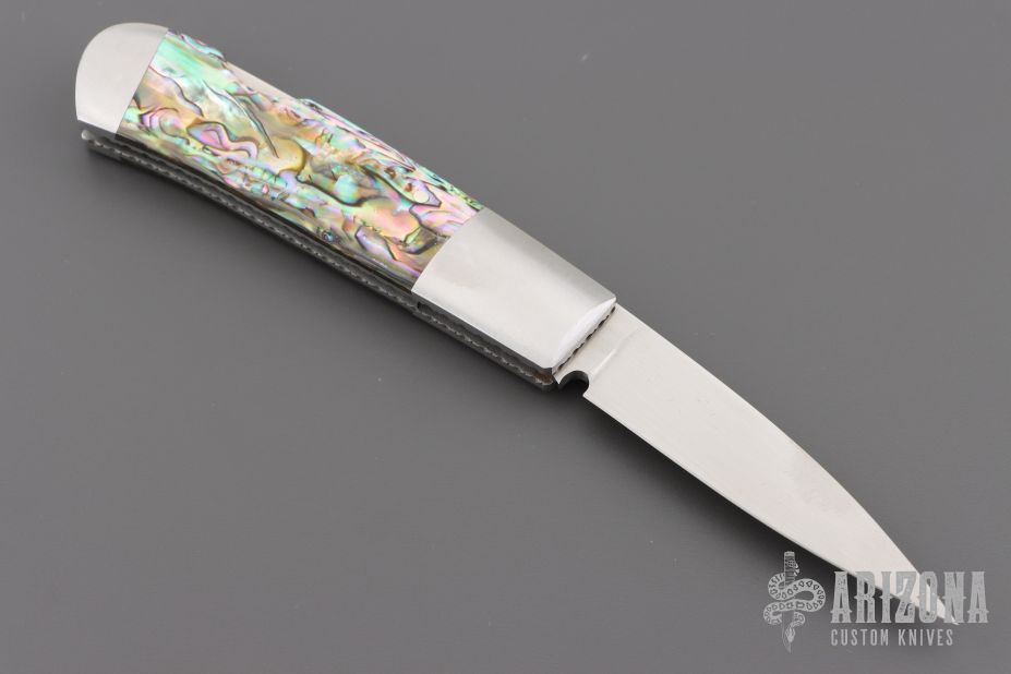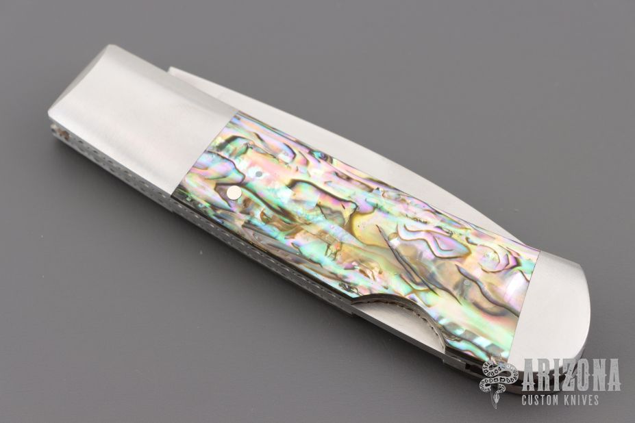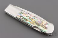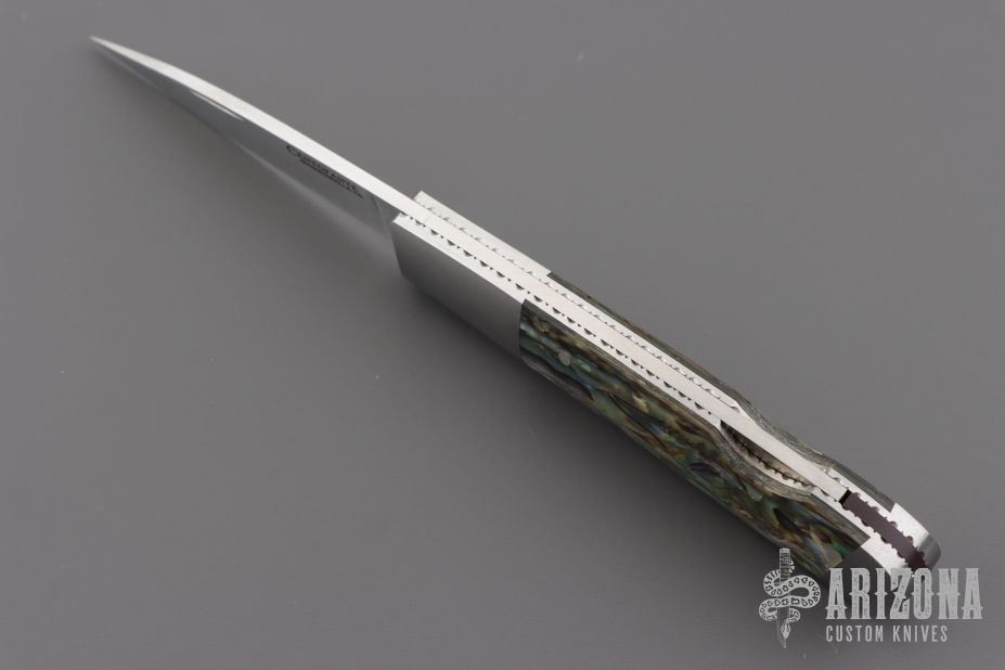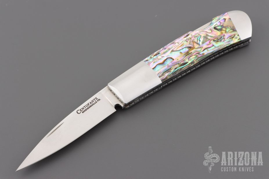 This Lockback folder by Frank Centofante features a hand rub satin finished drop point blade with nail nick. The handle has stainless steel dovetailed bolsters and fileworked liners, abalone scales, stainless steel lockbar and black linen micarta backspacer. Comes in a soft pouch. Excellent condition.