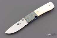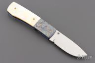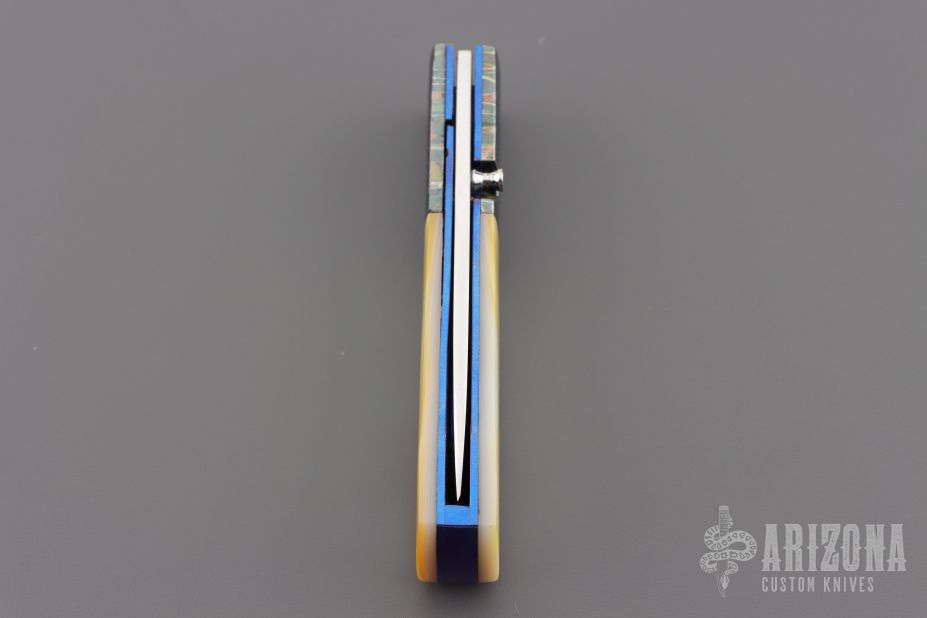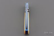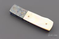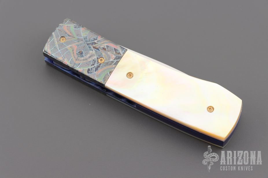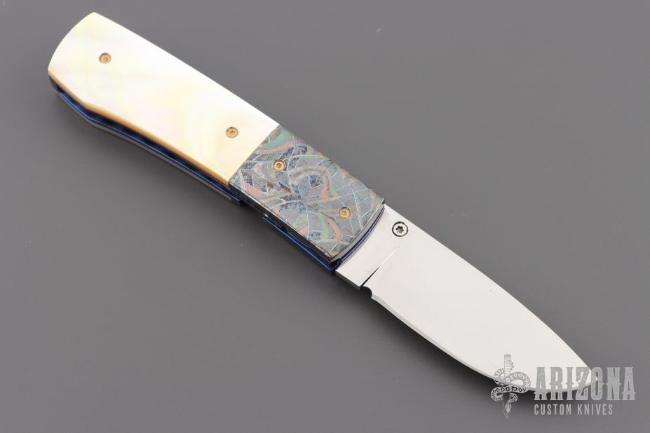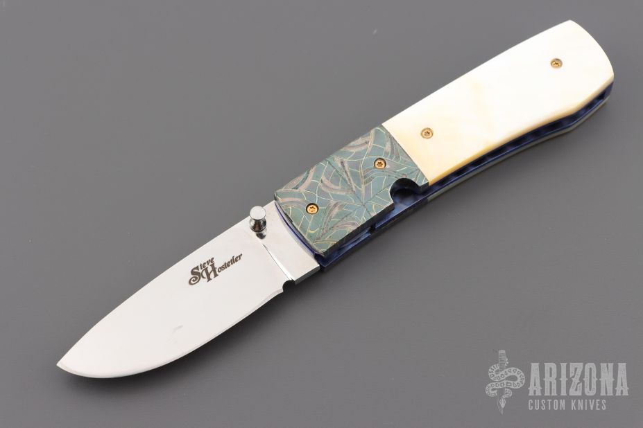 This linerlock by Steve Hostetler features a mirror polished blade with single steel thumbstud. The handle has mosaic Damascus bolsters, gold lip pearl scales, anodized titanium liners with jeweled interiors, anodized titanium backspacer. Gold plated screws. Nice detent, lockup and blade seating. Has some light scuffs and scratches, excellent condition otherwise.
