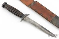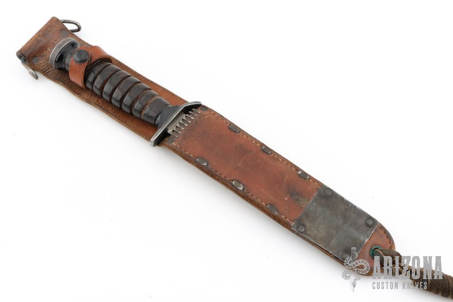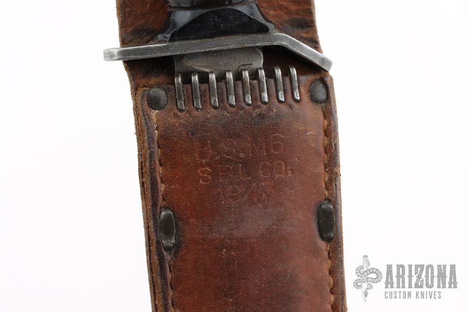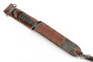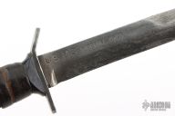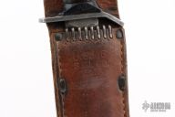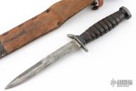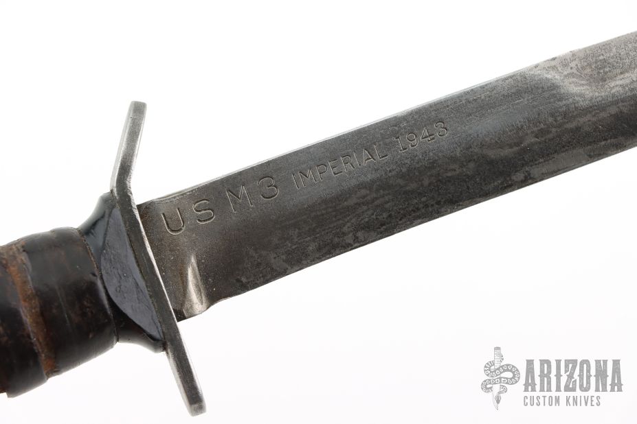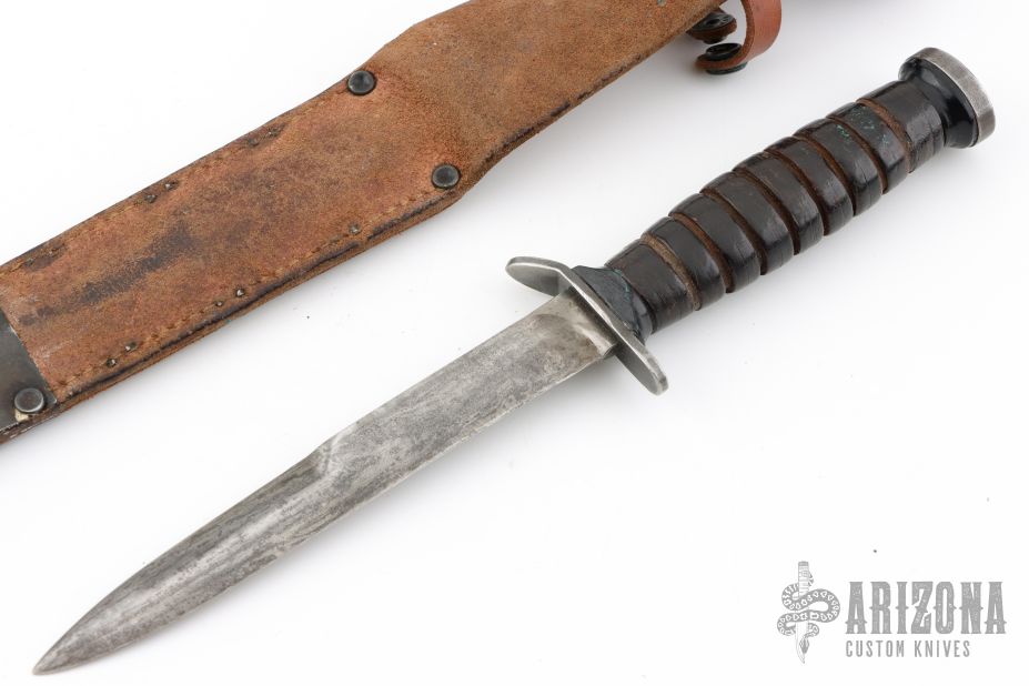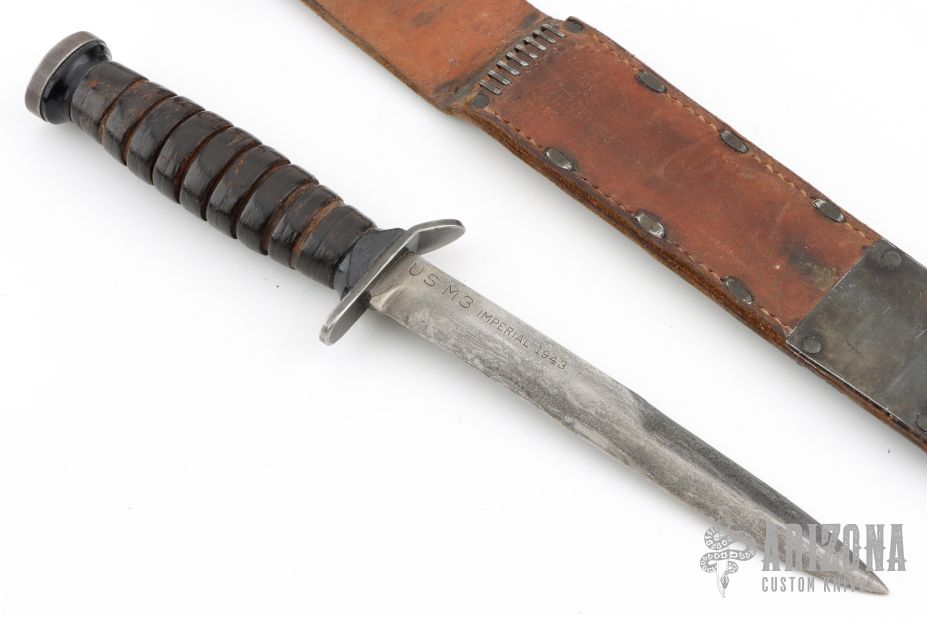 This M3 from Imperial Knives features a bayonet ground blade with sharpened top edge, .179" blade stock and .878" blade depth, hidden tang construction. The handle has a black guard and butt, and a stacked leather grip. Comes with a M6 SBL leather and metal scabbard with belt loop. Has scuffs, scratches, patina, and has been resharpened. Fair condition, good condition for its age.
