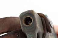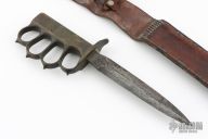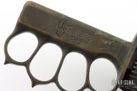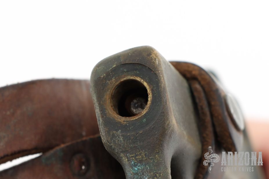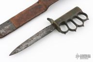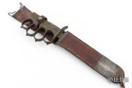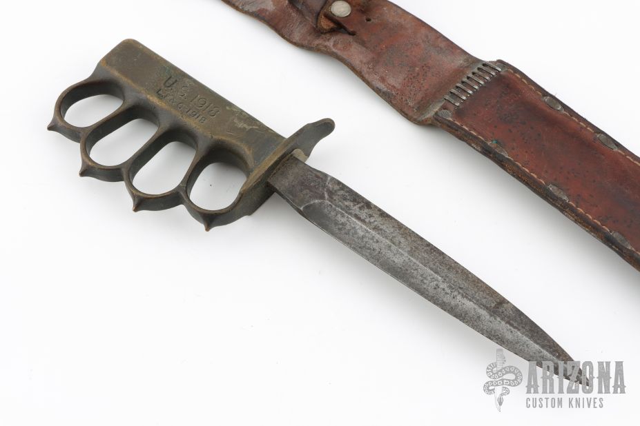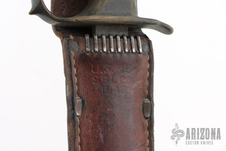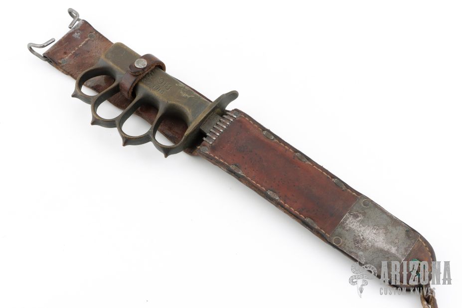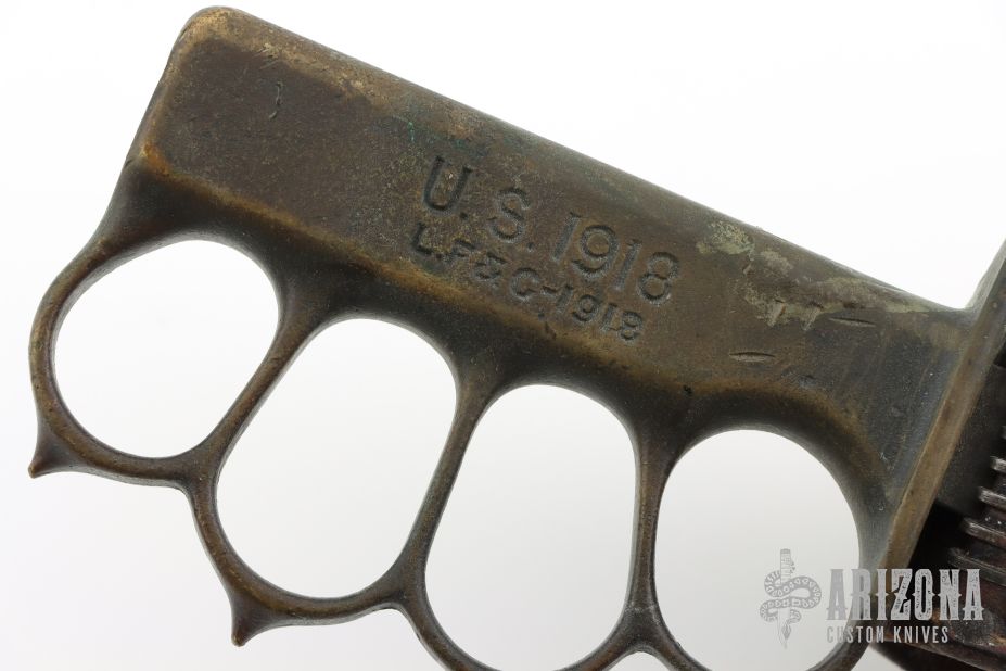 Extremely hard to find. This is a WWI trench knife made by L.F & C. Cast Bronze handle with U.S. 1918 stamped. Comes with M6 1943 SBL leather and metal scabbard. Has scuffs, scratches, and patina. Good condition for its age. The tang nut is included, but looks like it snapped off.