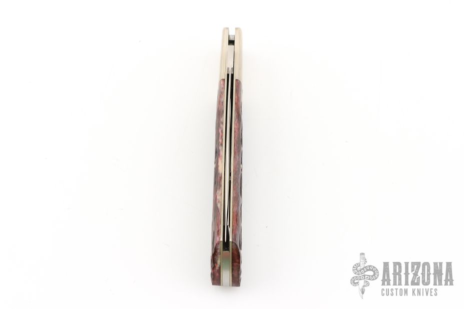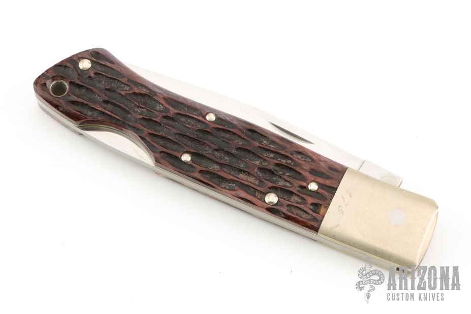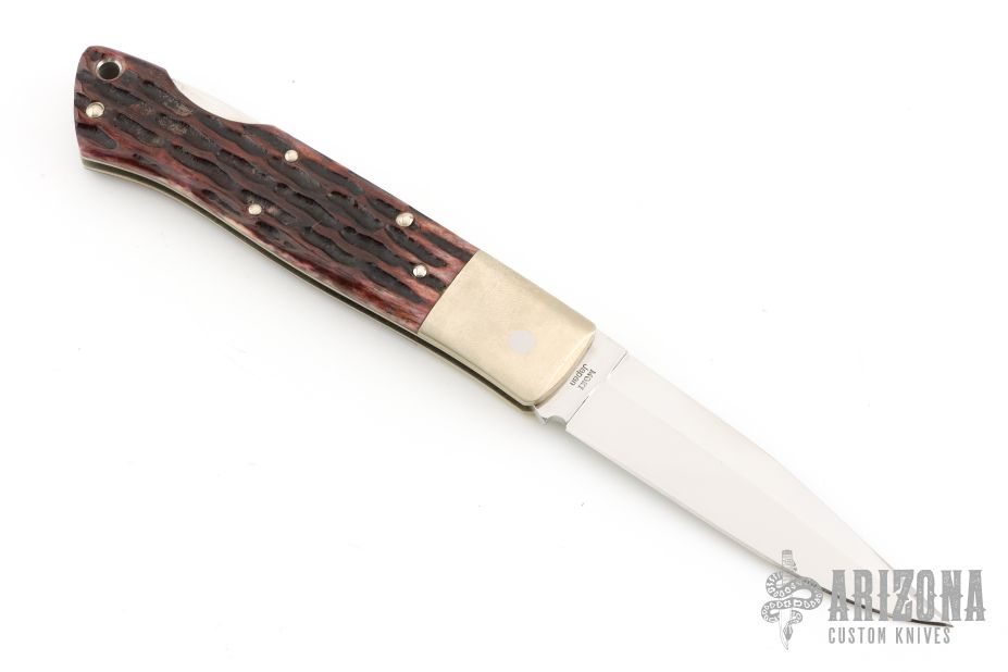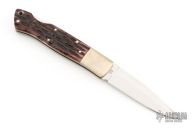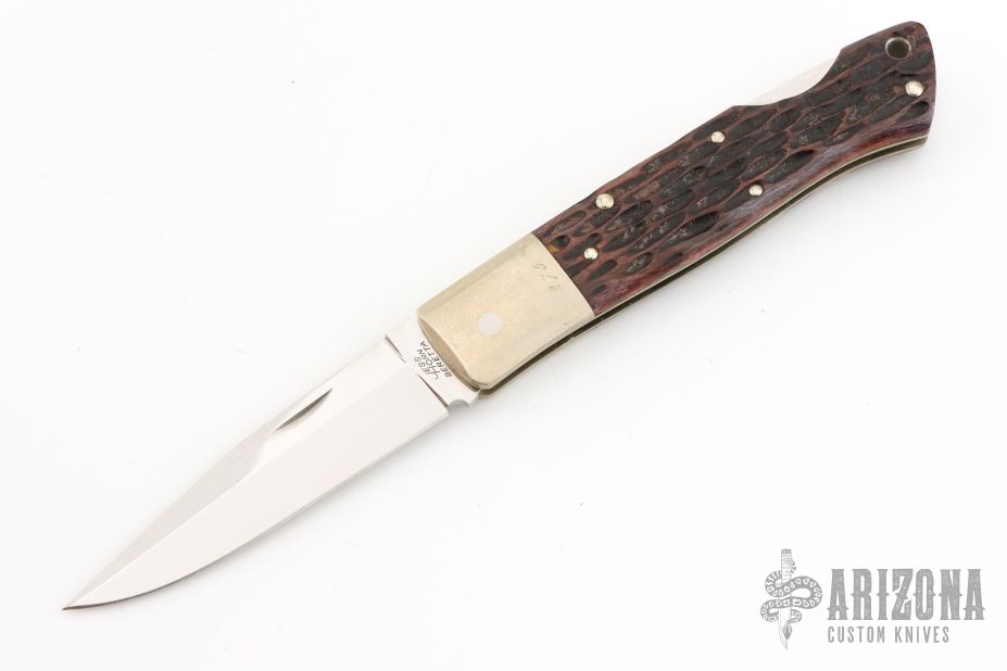 This "Jess Horn" edition of the Beretta Master Series features a mirror polished clip point blade with false top edge and nail nick. The handle is comprised of a nickel silver bolsters and dyed and jigged bone scales over nickel silver liners and stainless steel lockbar and backspacer. Lanyard tube in pommel. Numbered "275" on bolster. Comes with original box. Has a couple very light scratches, otherwise excellent condition.