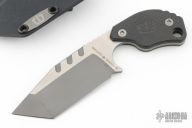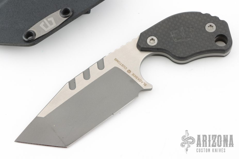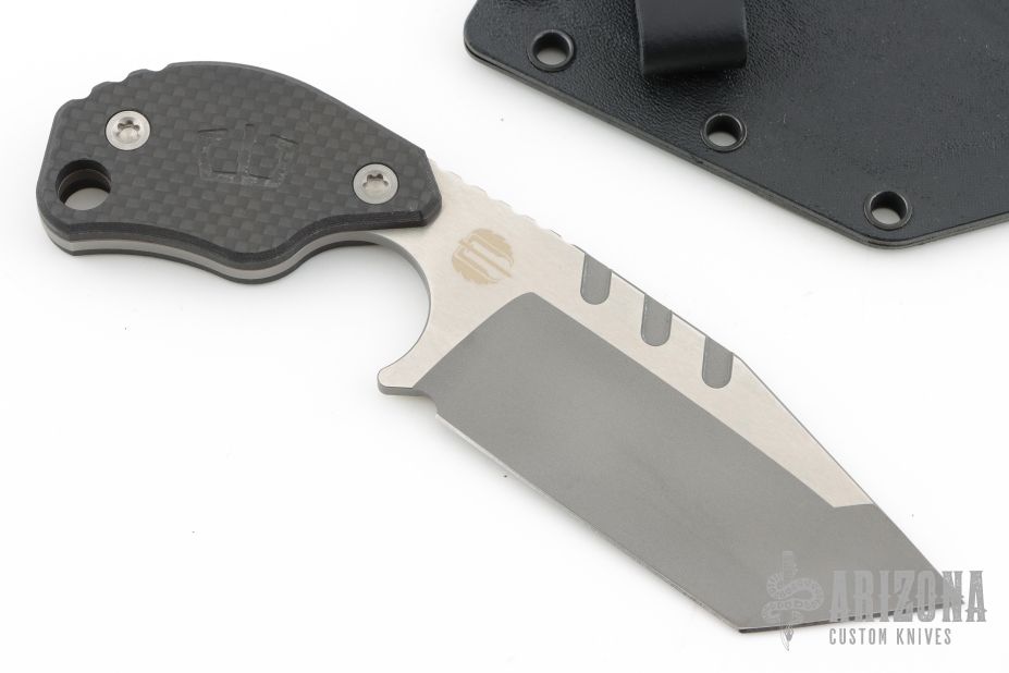 This SLCC by Mick Strider features a two-tone "Grey Matter" finished tanto blade with a notched thumbrest, .148" blade stock and 1.583" blade depth, full tang construction. The handle has carbon fiber scales. Comes with a kydex sheath, original box and COA dated Microbatch 2023. Has a couple light sheath scuffs, otherwise excellent condition.