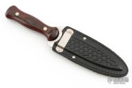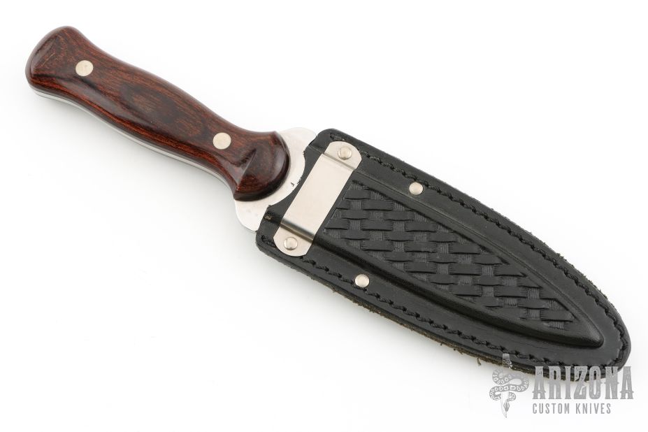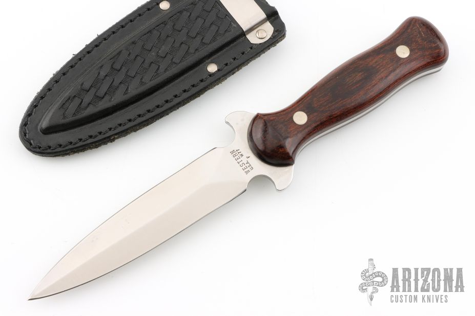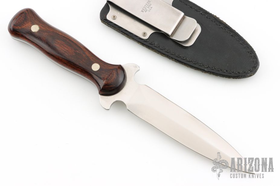 This discontinued boot dagger by Western Cutlery features a satin finished double edged blade with .126" blade stock and .972" blade depth, full tang construction. The handle has dymondwood scales with nickel silver pins. Comes with a tooled black leather boot sheath. Has some light scratches, otherwise excellent condition.