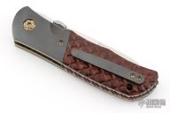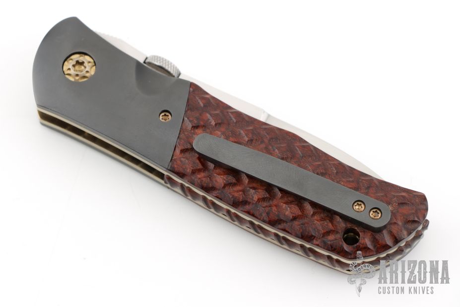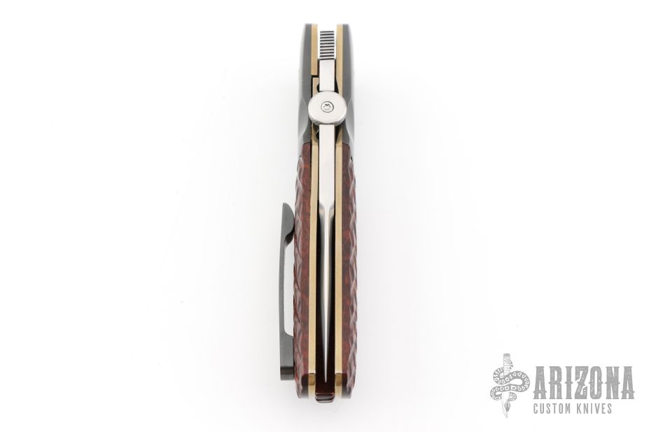 This SD-2 liner lock folder by John W Smith features a hand rubbed satin finish blade with thumbdisc. The handle has dovetailed zirconium bolsters and tip up pocket clip, checkered wood scales and backspacer, anodized titanium liners with jeweled interiors. Perfect function. Strong lock up, nice detent and blade seating is dead center. Includes a padded zippered case. Excellent condition.