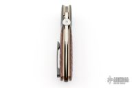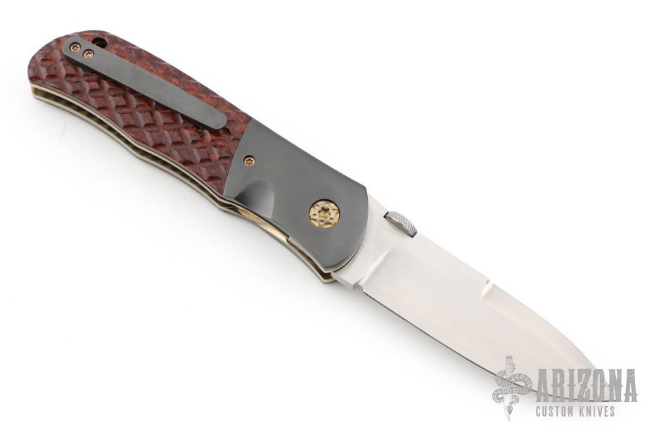"I have been a fulltime maker since 1993 and am proud to be a voting member of the Knifemakers Guild. Most of my work is in embellished locking folders, with an occasional art fixed blade. In 1994 I began doing my own engraving and started making Damascus in 1999. I prefer natural handle materials such as mother of pearl, fossil Ivories and stone. Blade steel is my Damascus (unless otherwise noted) or one of the high quality stainless steels currently available. The embellishments I offer are engraving, gold inlay, mosaic pearl inlays, file work, carving and solid 14K gold screws and thumb studs that I make in shop."