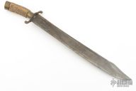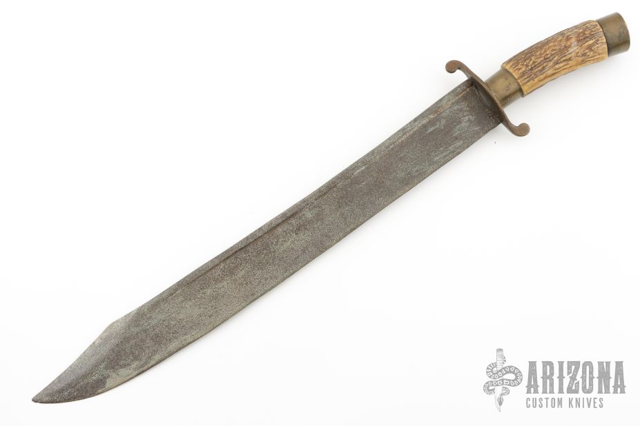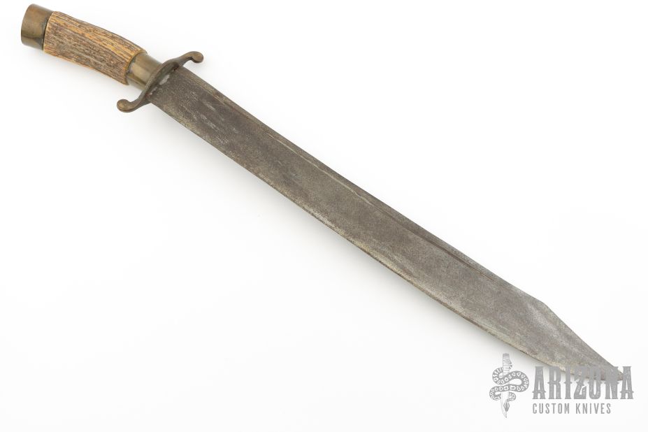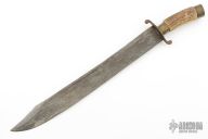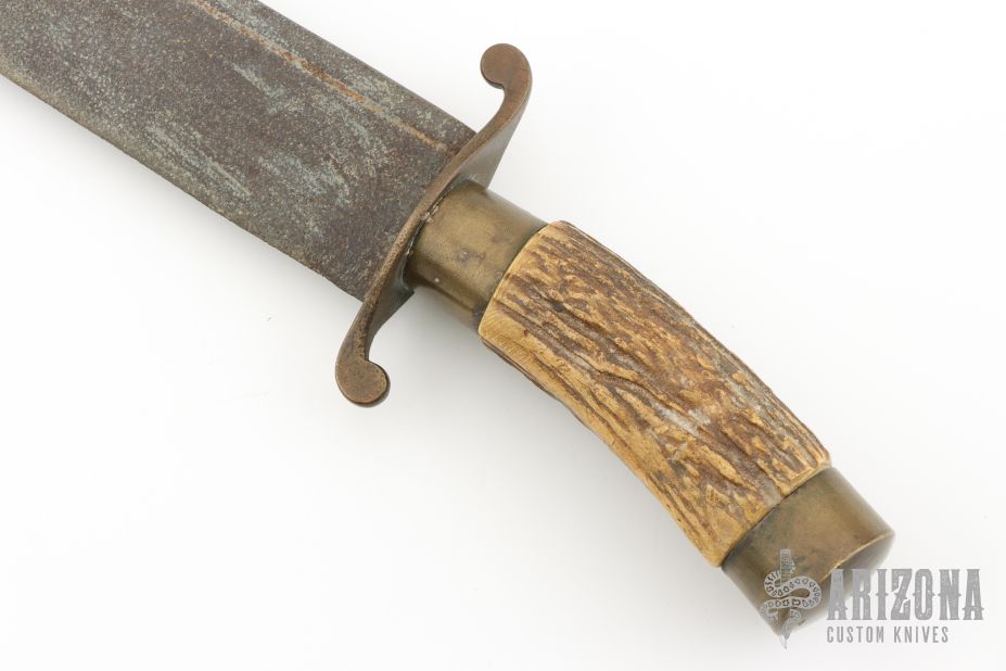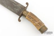 19th Century Quaker Bread Knife. It appeared in the old Flayderman & Morris Catalogs. It has a carbon steel blade with fullers, .196" blade stock and 2.111" blade depth, hidden tang construction. The handle has a brass guard and fittings with a stag grip. Has pitting on the blade, has patina, its old.