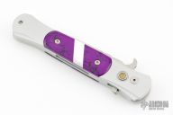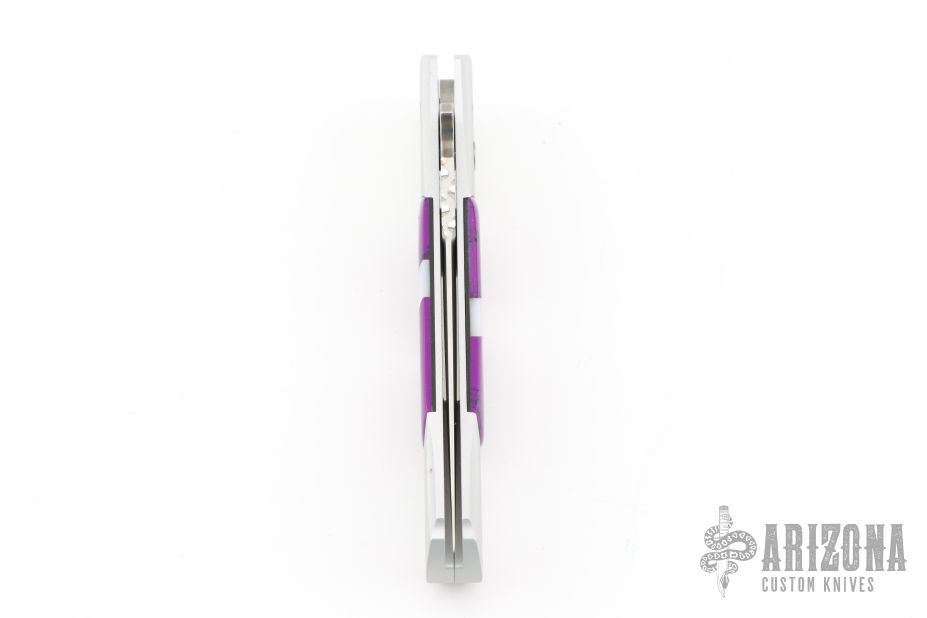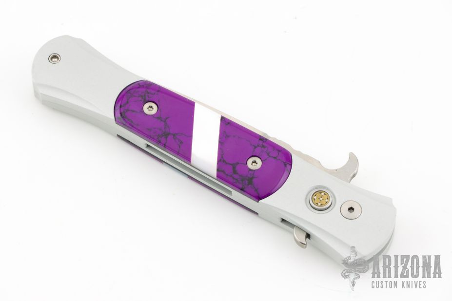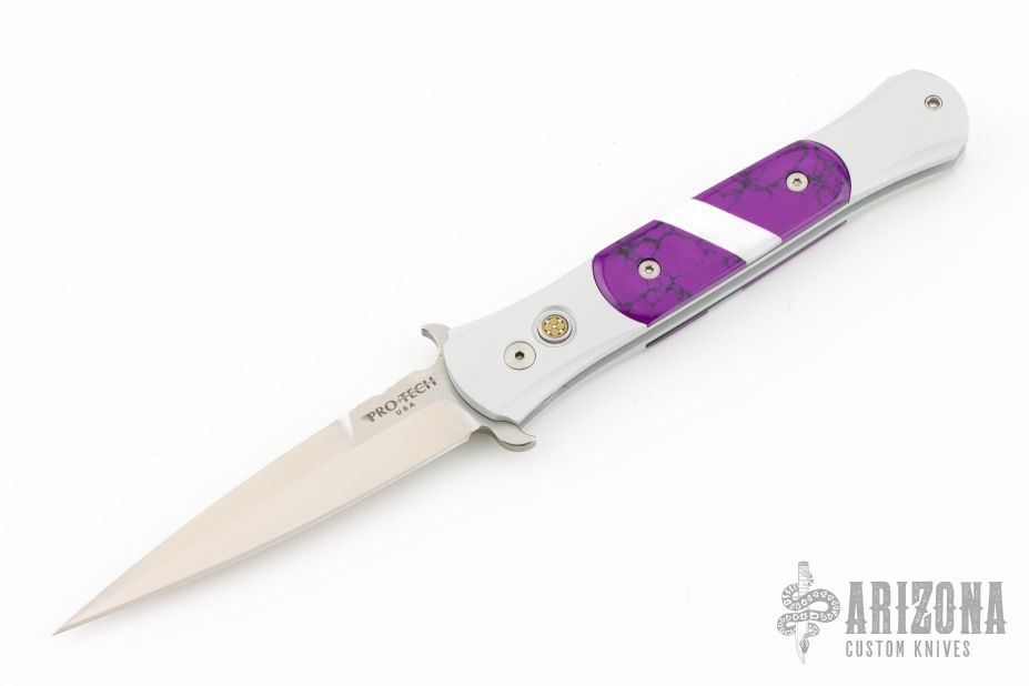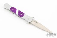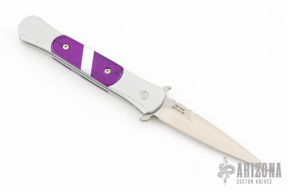 This Don features a satin blade, satin silver aluminum handle, and purple and pearl inlays. Excellent Condition.