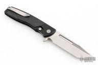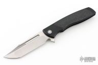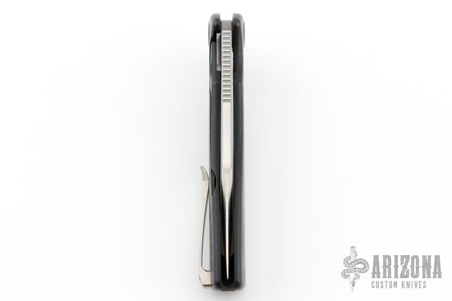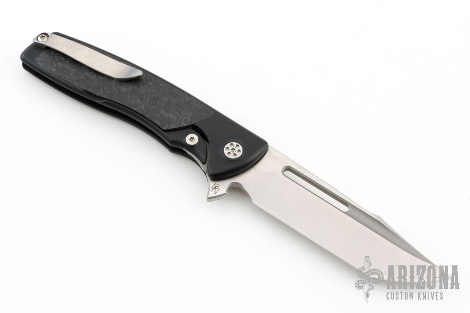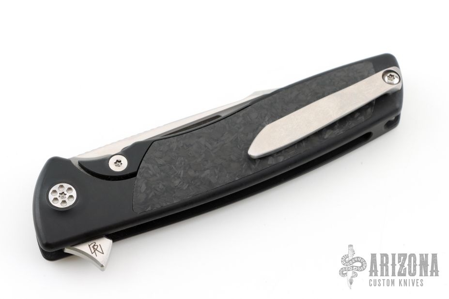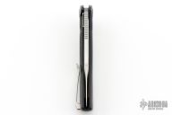 This Evo Typhoon from Brian Nadeau features a hand rub satin finished blade with a fuller and thumbrest. The handle is comprised of a black tumbled titanium frame with marble carbon fiber inlays, satin titanium tip up clip. Rides on bearings, nice detent, lockup and blade seating, stainless lockface insert. Has a couple light scratches, otherwise excellent condition. Comes with a zippered case.