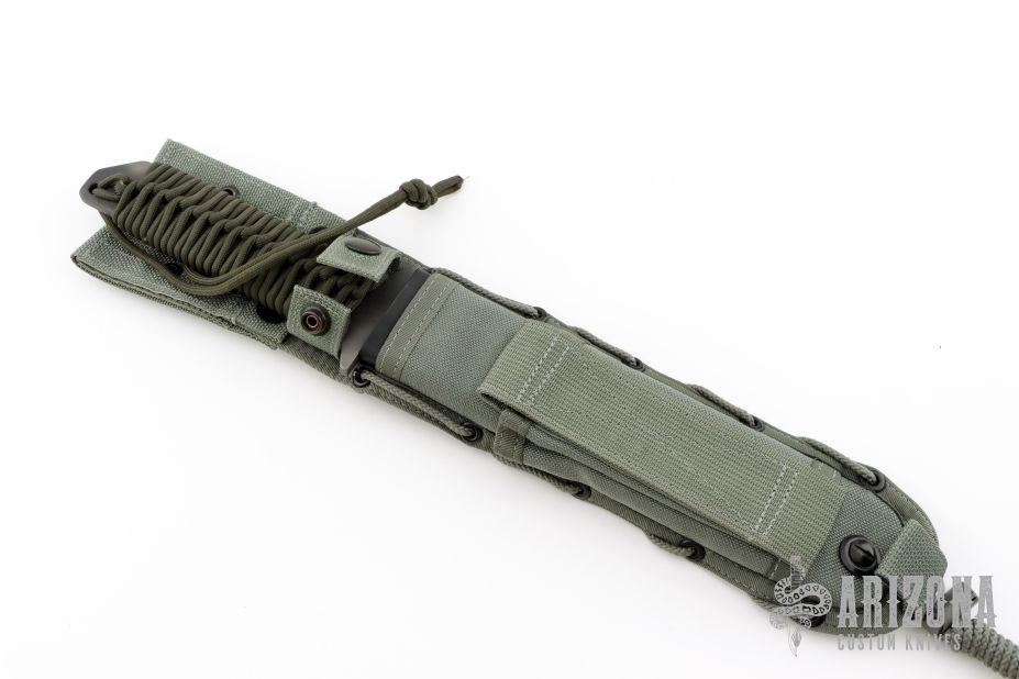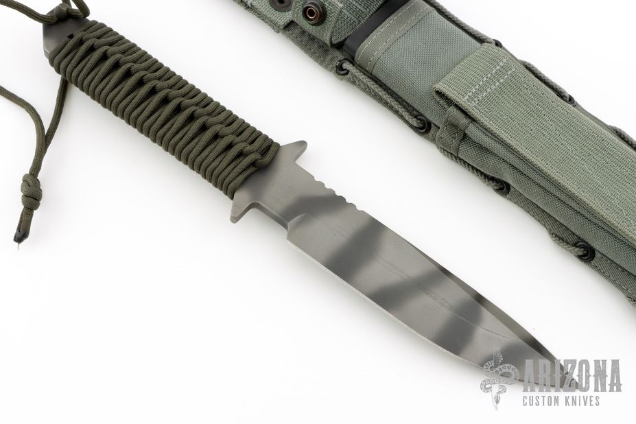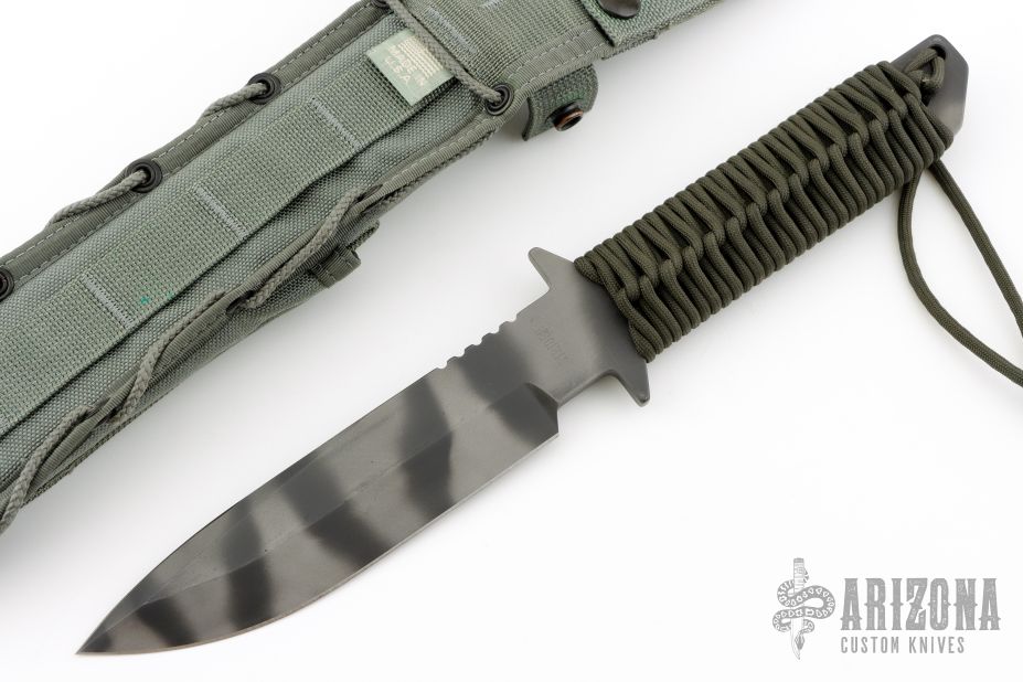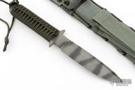 This MT-L by Strider features a tiger striped blade with sharpened top edge and notched thumbrest, .239" blade stock and 1.410" blade depth, full tang construction with paracord wrapped handle. Comes with a nylon sheath. Has some light scuffs, otherwise excellent condition.