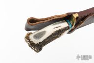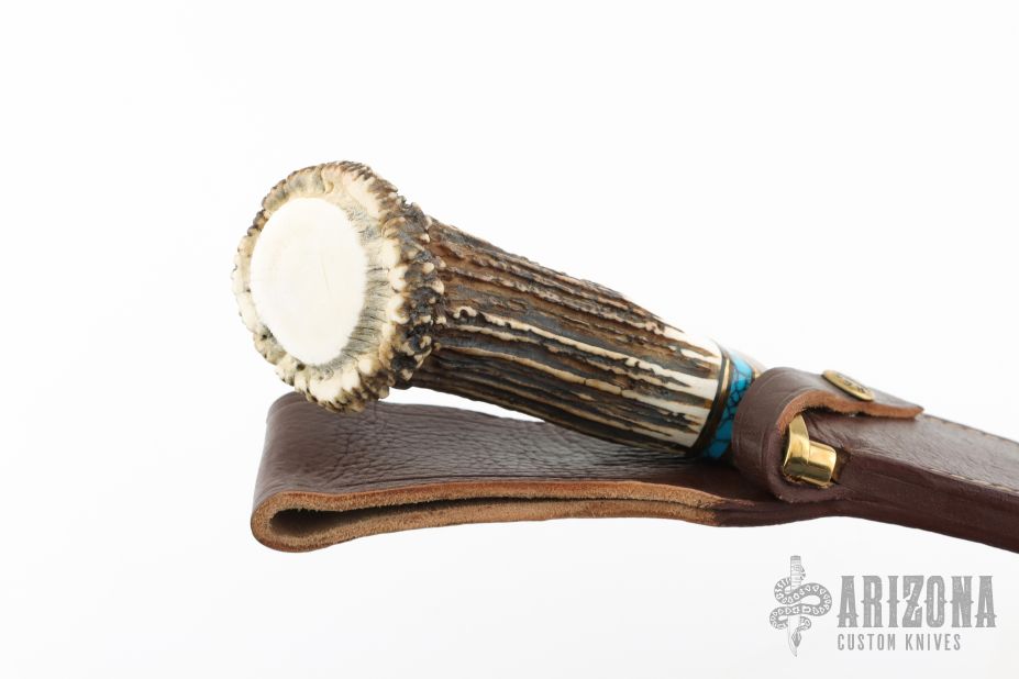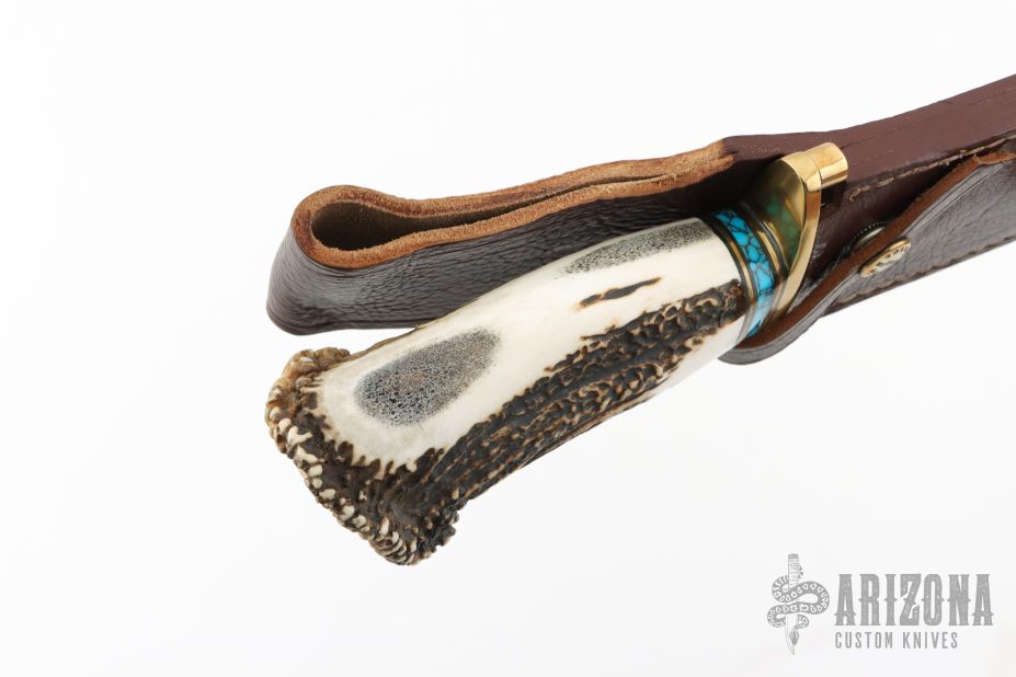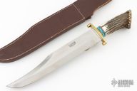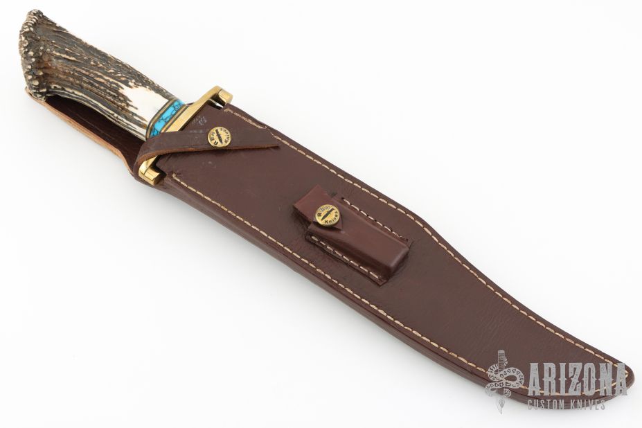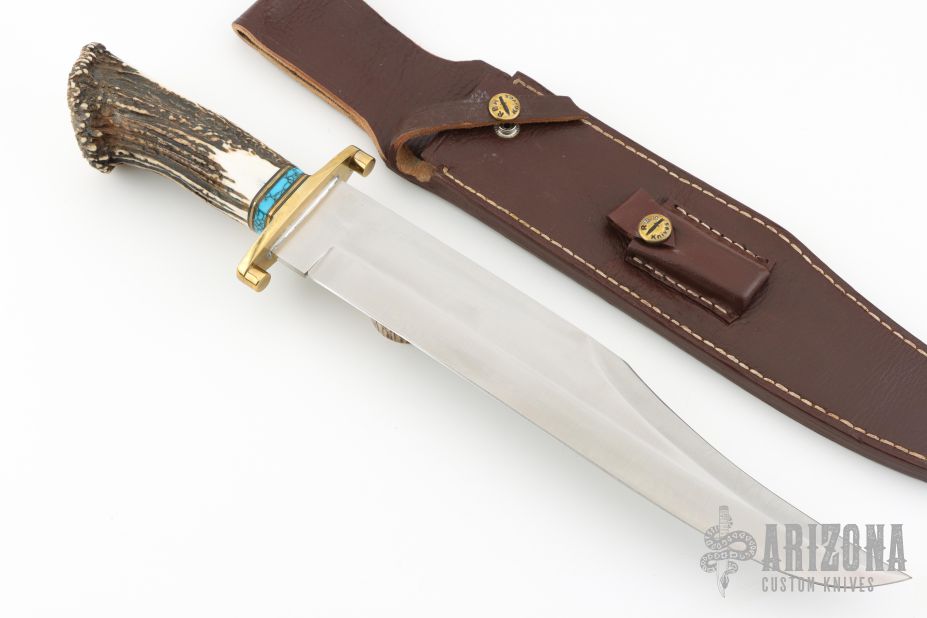 This Bowie by RBH Custom Knives features a satin finished blade with a sharpened top edge, .208" blade stock and 2.102" blade depth, hidden tang construction. The handle has a lugged brass guard, crown stag grip with black/brass/turquoise spacers. Comes with a brown leather sheath. Has a couple very light scratches, otherwise excellent condition.