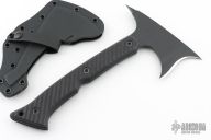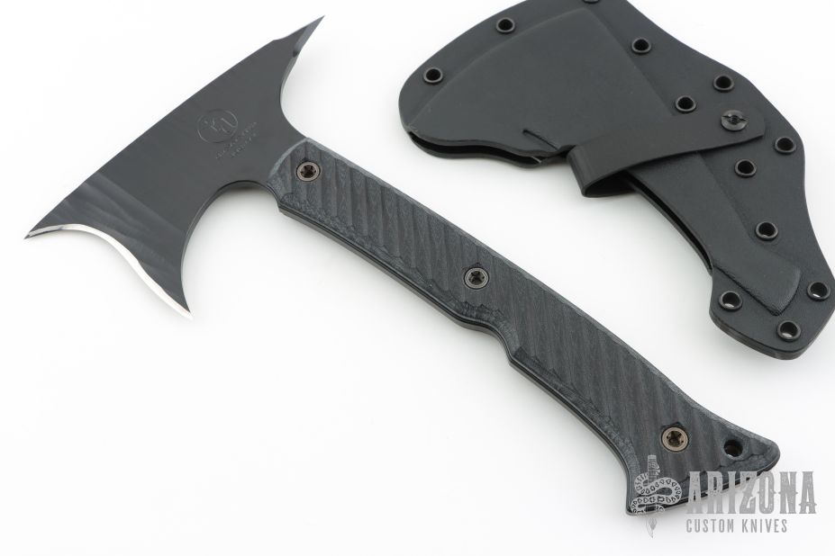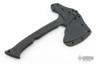 The Graymatter tomahawk offers full tang construction made from 3/16" 80CRV2 carbon steel and has a Cobalt Cerakote finish for increased corrosion and wear resistance. The aggressive head is purpose designed with defensive use in mind. The handle scales offer a contoured 3D texture that works effectively in both wet and dry environments without an overly aggressive feel. The head features a razor sharp, 3” forward facing edge, along with a wicked spike at the rear. The tomahawk includes a bottom eject scabbard with low ride MOC Straps for belt carry.