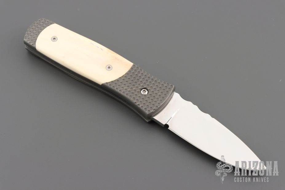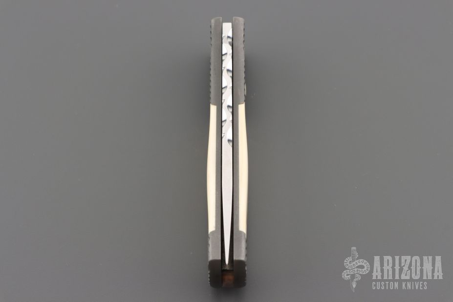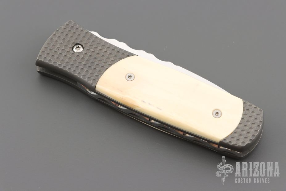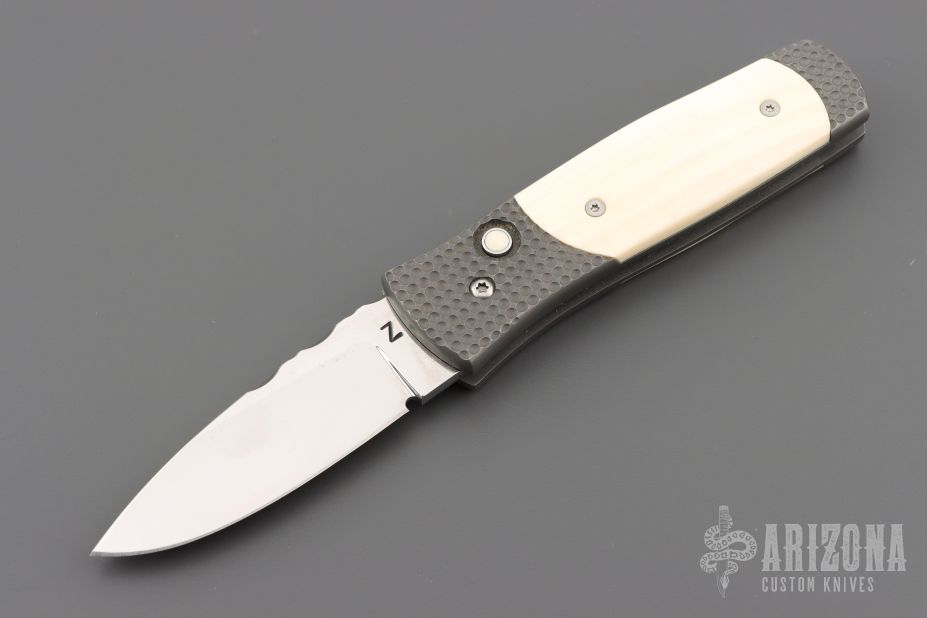 This Automatic by Z Custom Knives features a mirror polished drop point blade with file worked thumbrest. The handle is comprised of a bead blasted titanium frame with Mammoth inlays and inlaid push button over a fileworked stainless steel backspacer, tip up stainless steel clip. Has some light scuffs, otherwise excellent condition. Hard to find!
