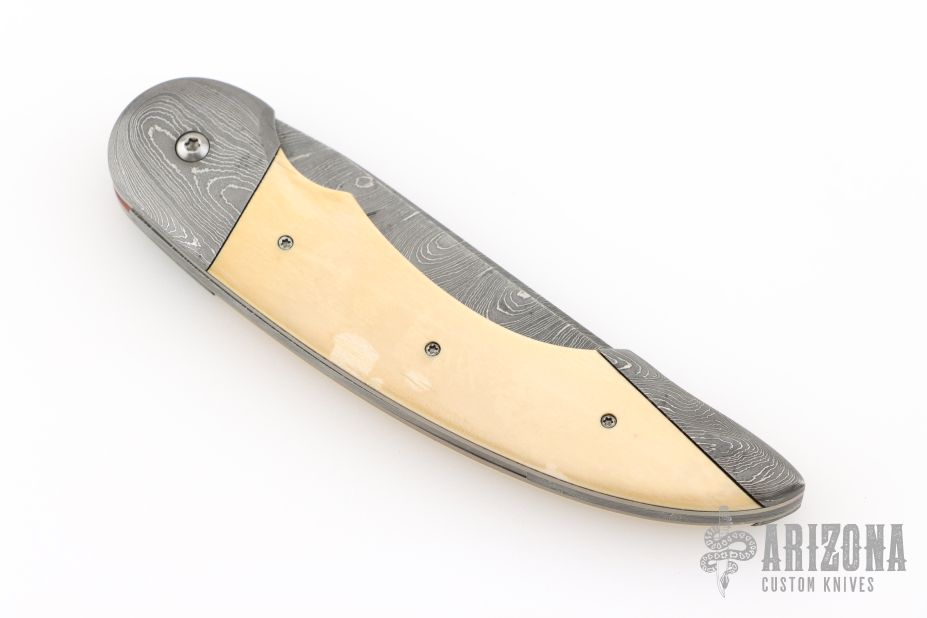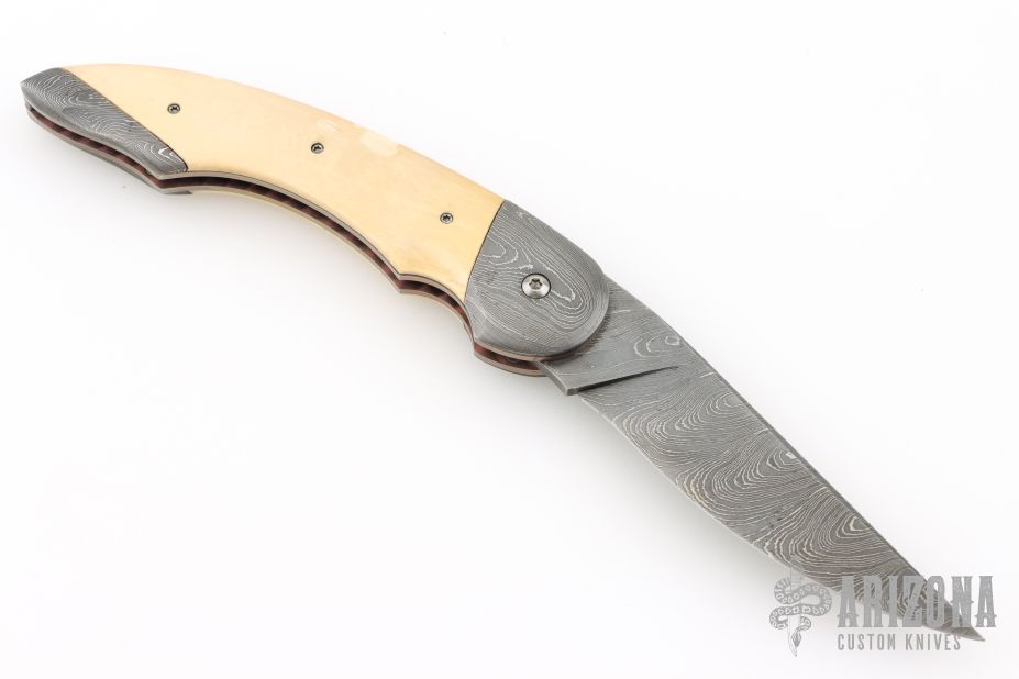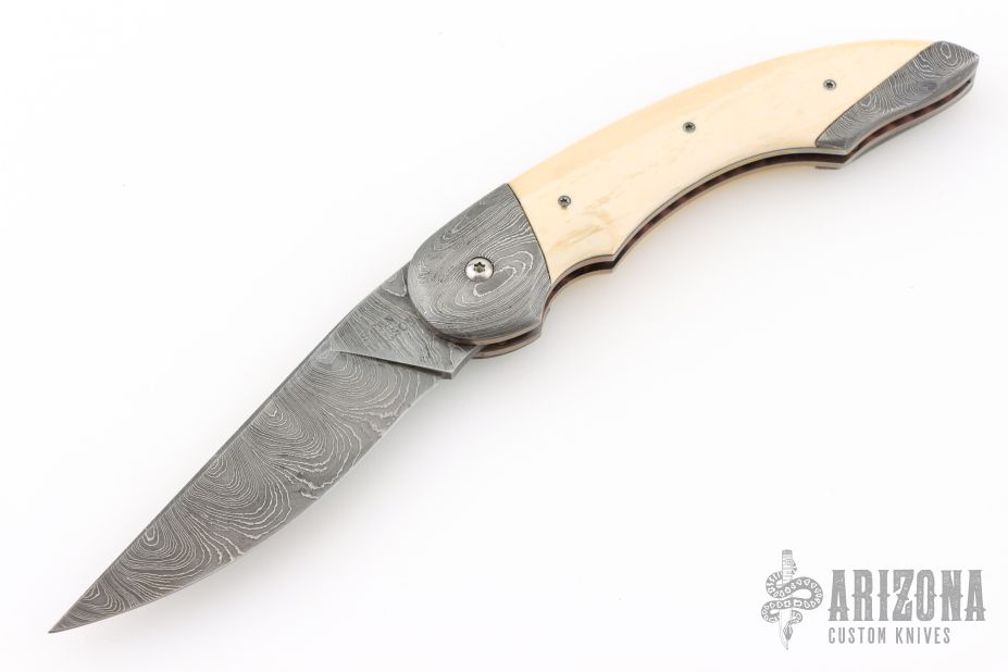 "All my life I have been a maker of many things, a jack-of-all-trades if you will. The idea of making a knife had been with me for a long time. Ever since I was a small boy I have always carried a knife, to me it was an Indispensable tool, never to be without. Later on in years, it was a good friend & hunting partner who finally got me started in knife making, though he was unaware of it. Every time we went hunting he would tell anyone who would listen about his knife, an old Rudy Ruana. The knife I carried at that time was nothing special, so one day after hearing one of his stories for umpteenth time I decided to make a knife of my own. I was going to apply all my crafting skills to this task. Little did I know that what I was plunging into was first going to evolve from a hobby, to an obsession, to something that would become my livelihood. That first knife was made from scavenged materials. A chainsaw bar for the blade, a copper electrode was made into the guard, the handle cut from an old rosewood picture frame. It took months of trial and error to finish that knife, but Upon completion of the first, I felt challenged to make another, but better. This is and always will be my creed. I promise to deliver each knife better than the last. That is the true challenge of what drives me today, to deliver the best I can. So I will go any length to ensure satisfaction and deliver what is truly a hand crafted knife. My choice of materials for my knives are natural and exotic handle materials such as pearl, bone, ivory or fine burlwood combined with a Damascus blade. All my knives are made by stock-removal, free hand ground and hand finished. I do not work off of set patterns, but from a simple drawing. This takes a little more time but it also allows me to be more creative and have full control to make slight changes to each custom knife, obviously as result no two knives are ever identical. My first knife was it was once described by another knife maker as organic in design. My basic designs still reflect that organic flow, graceful curves and a minimum of straight lines. I maintain sole authorship on all my knives with the exception of the Damascus I use and heat-treating of stainless steels. Like many makers I began with fixed blades, as I gained skills I moved into folders, then autos. Lately I have taken to building my folders with all the screws hidden."