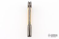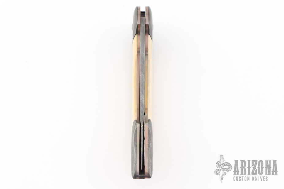 This Early Scale Release Automatic by Stan Wilson features a Damascus blade. The handle has dovetailed Damascus bolsters, mammoth ivory scales, anodized and jeweled titanium liners, Damascus backspacer. Nice action and blade seating, has a little blade play, otherwise excellent condition. Comes with a zippered case.