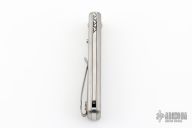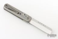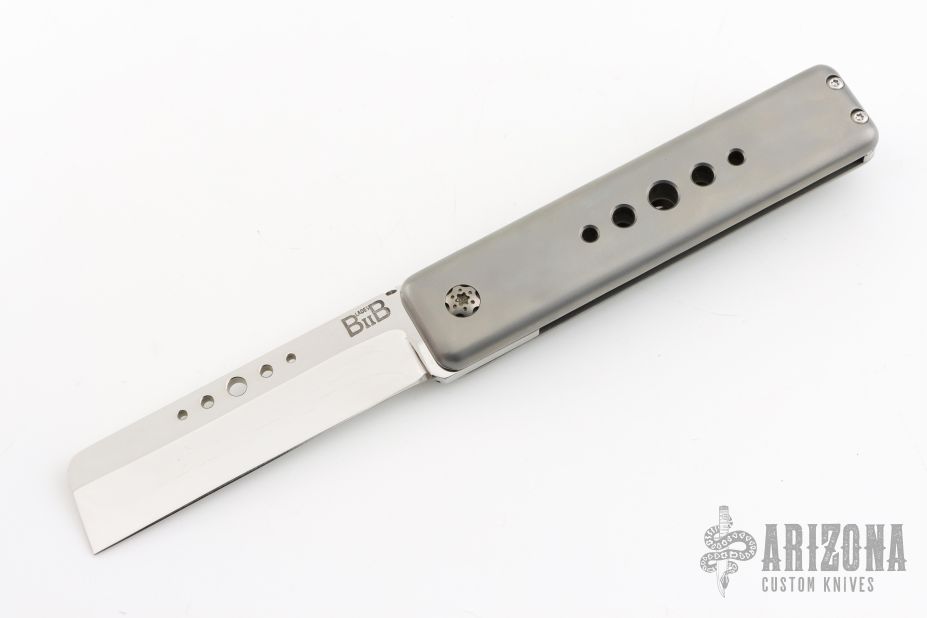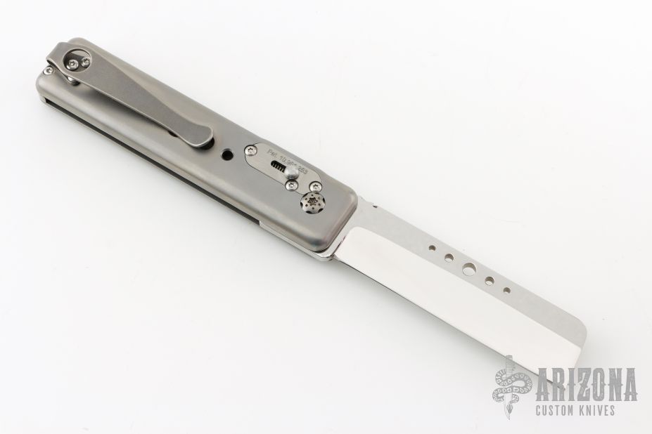 The Saguaro Variant Knife is a variation of the Saguaro Gentleman's knife with some decorative holes in the handle and in the blade, along with a Sheepsfoot style blade. This is still a fully custom made knife, with a front flip opening design. The blade is hand ground with custom hand made file cuts. The other parts are machined in house and each knife is assembled by hand. This item is only available in the US.