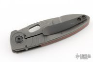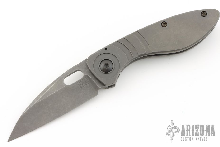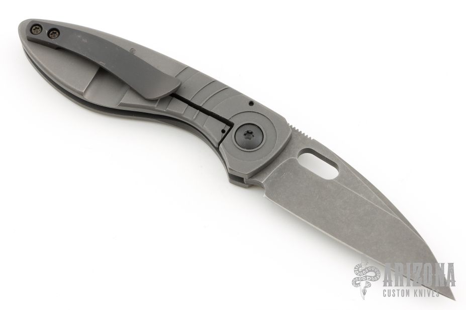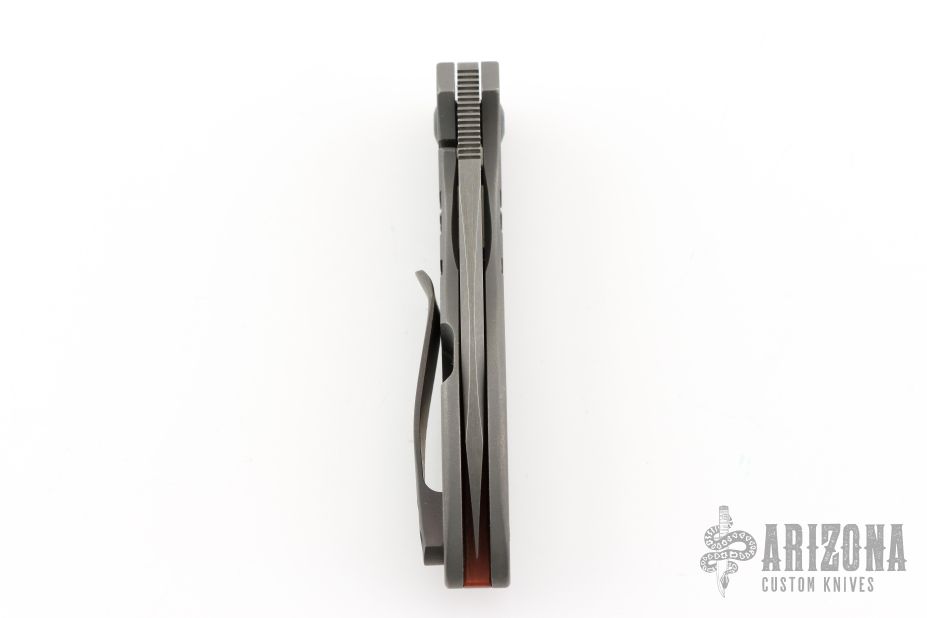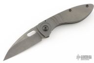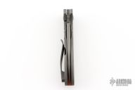 This Gannett by Jared Price features a dark tumbled blade with swedge, thumbhole and notched thumbrest. The handle has a blasted and tumbled titanium frame, black titanium pocket clip, vintage cheddar micarta backspacer. Excellent blade seating, detent and lock up, rides on bearings. Comes with COA dated 2/15/2024. Has a couple light scuffs, otherwise excellent condition.