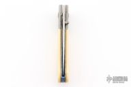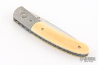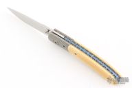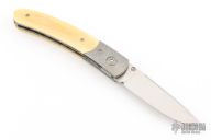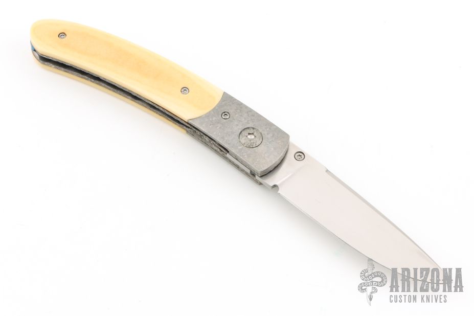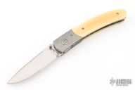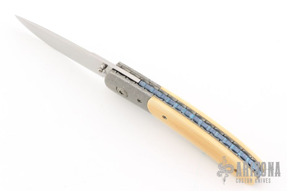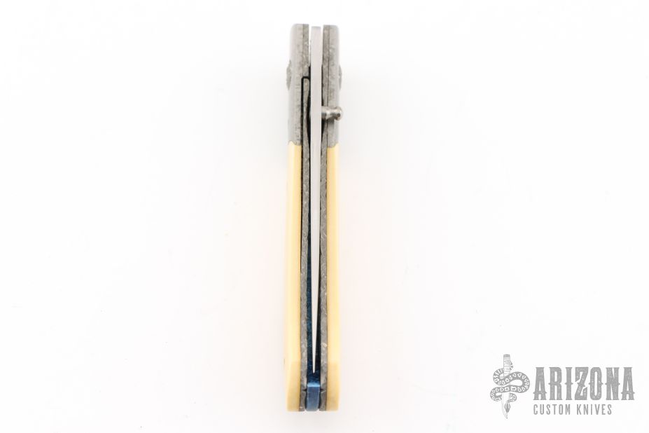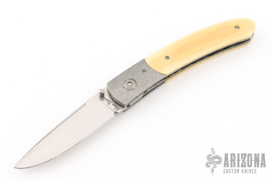 This knife by Alan Davis features a hand rub satin finished blade with a single thumbstud.  The handle has crystallized titanium bolsters, vintage Westinghouse paper micarta scales, textured and fileworked titanium liners with jeweled interiors, notched and anodized crystallized titanium backspacer. Nice detent, lockup and blade seating. Excellent condition. Comes with COA dated 3-16-24