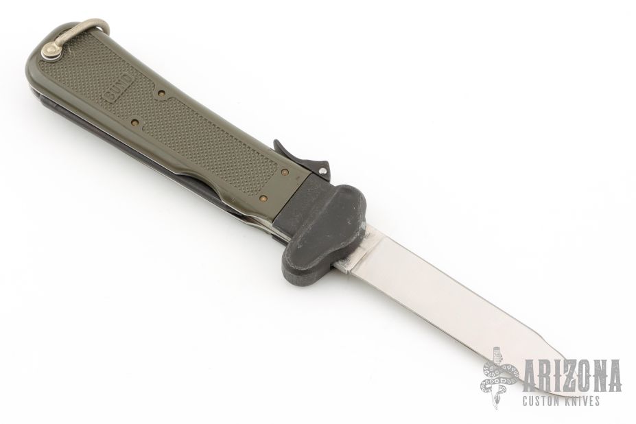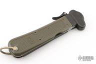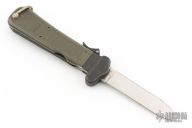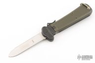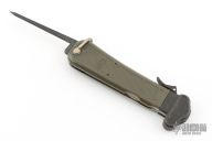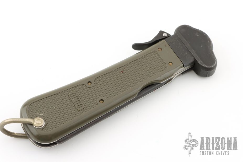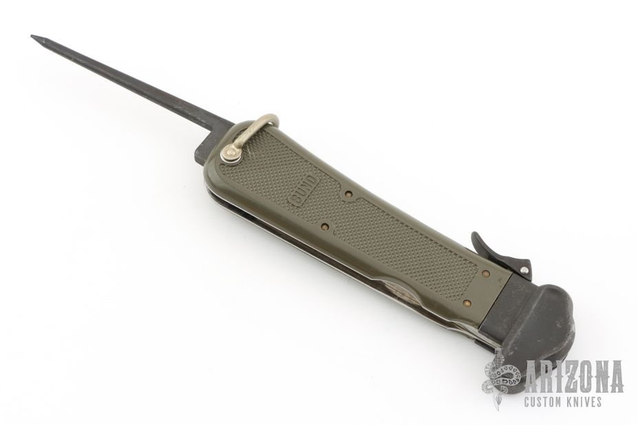 This German Army Paratrooper Knife from Bund features a spear point satin finish gravity blade. The handle is comprised of a steel guard and lever with OD Green plastic scales over metal frame. D Ring lanyard bail and lanyard on pommel. Knife also features a steel C4 punch/Marlin spike that deploys to the rear of the knife. Comes in a box. Has some light scuffs and scratches, excellent condition otherwise.