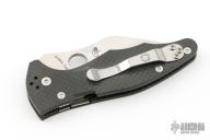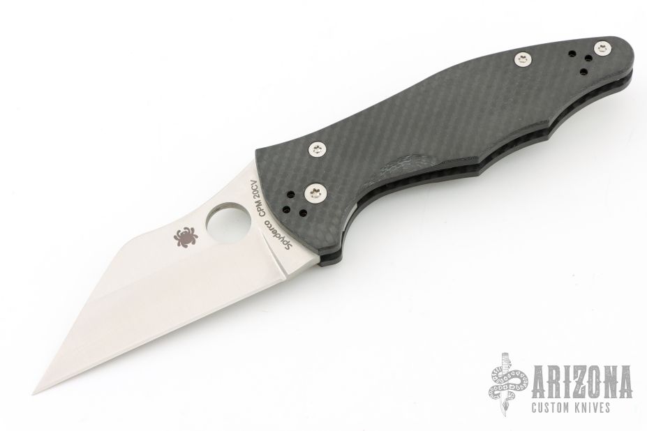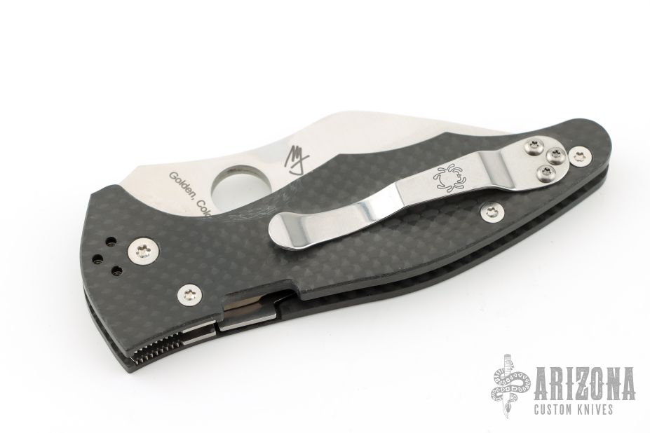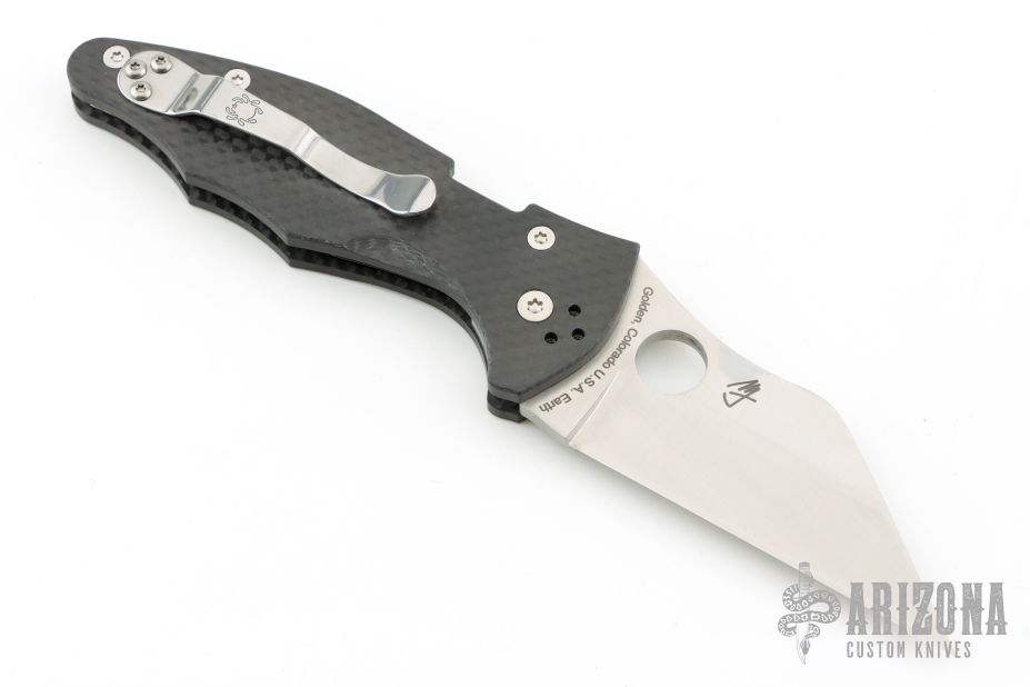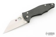 This Yojimbo 2 Linerlock Folder by Spyderco has a satin finished 20CV wharncliffe blade with thumb hole. Handle is carbon fiber with single liner (top-side lock), and 4-way reversible stainless steel clip. Comes with original box and paperwork. New condition.