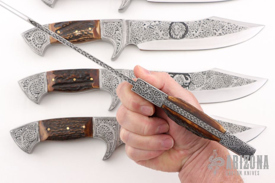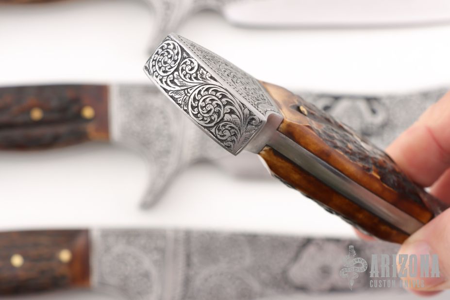 This knife features a satin finished blade with engraved flats with a Water Buffalo on both sides, .193" blade depth, 1.907" blade depth, full tang construction. The handle has engraved stainless steel bolsters, stag scales with brass pins, engraved tang. Comes with a hand tooled brown leather sheath.