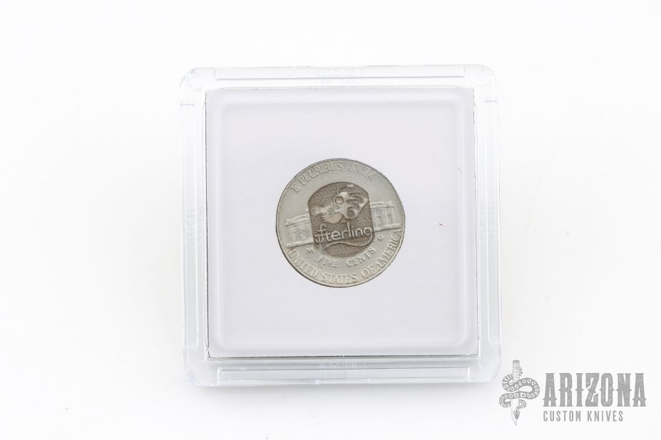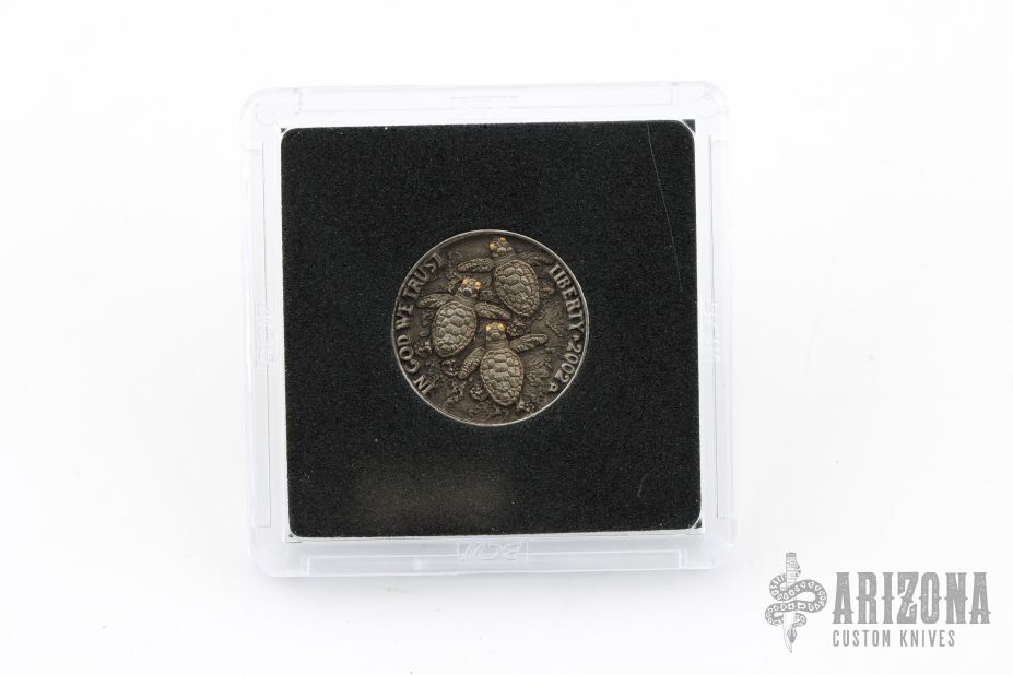 This sole authorship "Hobo Nickel" coin was created by Tom Sterling using a unique combination of advanced technologies and ancient hand engraving and carving methods.  Techniques include state-of-the-art laser engraving, and hand carving and hand engraving, each method carefully chosen for its own best effect.  Carved with a hatchling baby sea turtles theme with 6 hand engraved 24 karat gold inlaid eyes, from a US 2002D 5 cent coin. Comes with COA. One of an Edition of three. New from maker!