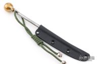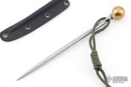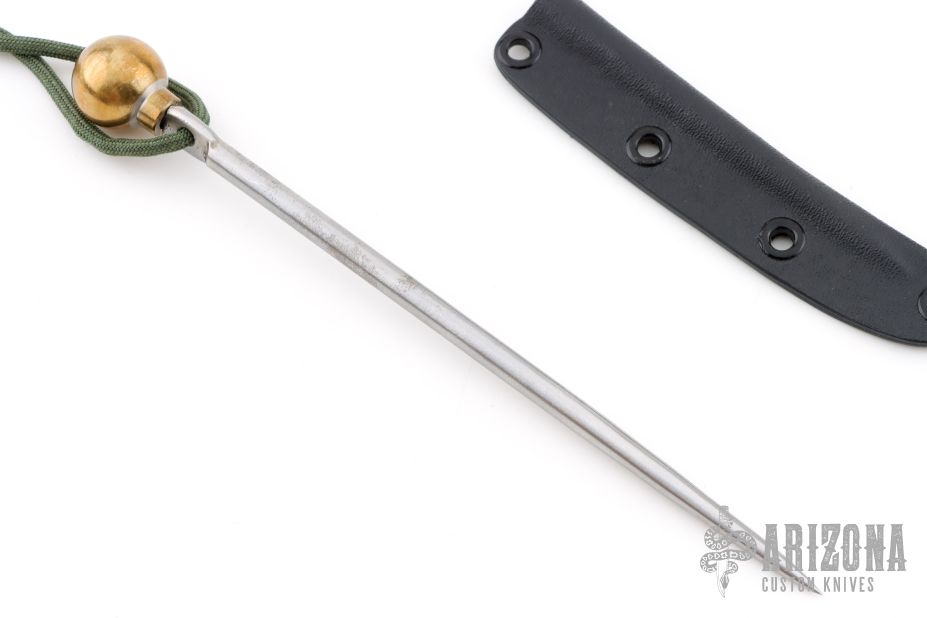 This spike was made from steel, has a lanyard hole, and brass ball on the handle. Comes with a kydex sheath. Shows some light wear. Excellent condition.