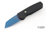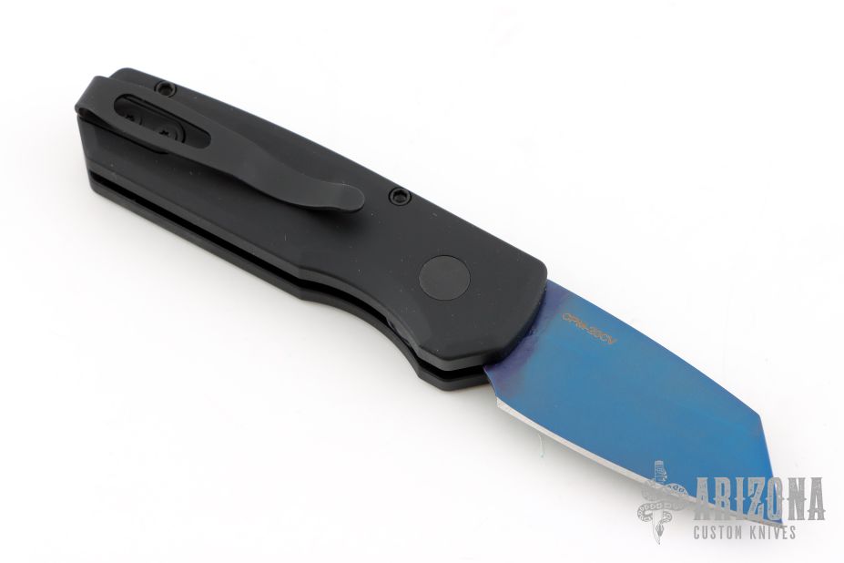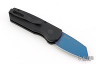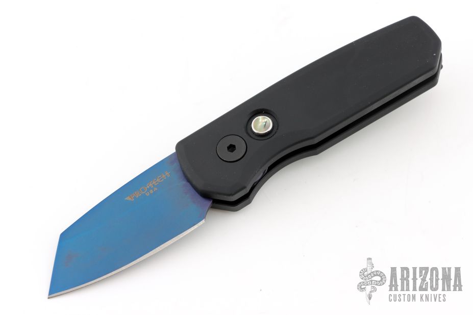 The Runt 5 by Pro-Tech Knives features a sapphire blue sheepsfoot style blade. The handle features a black aluminum handle with a black tip up stainless steel pocket clip. Abalone inlaid push button. New from maker.