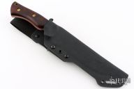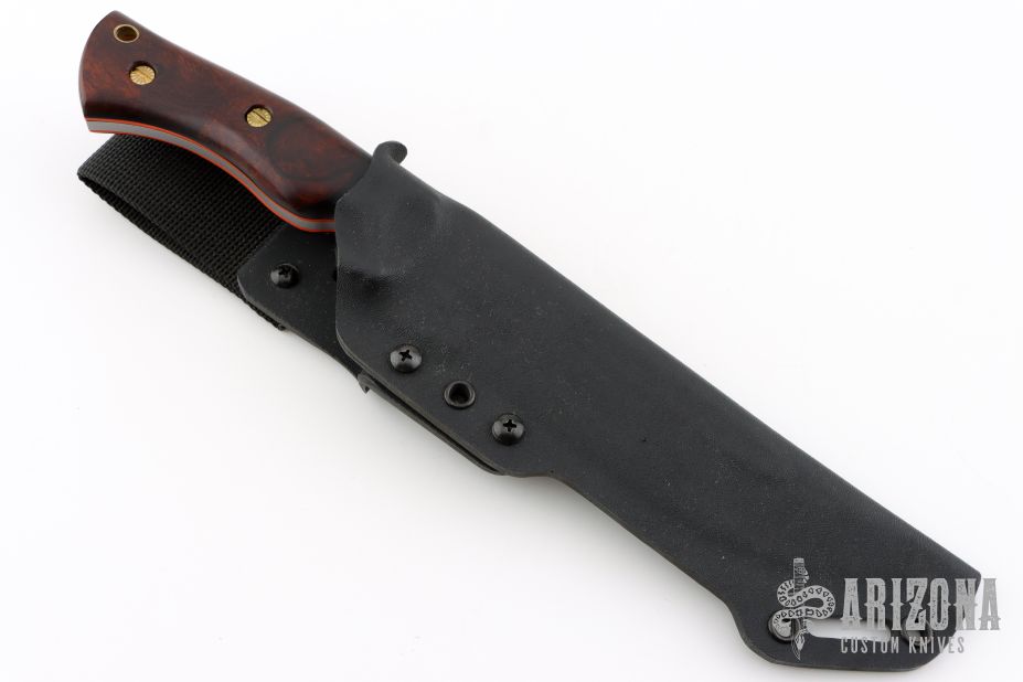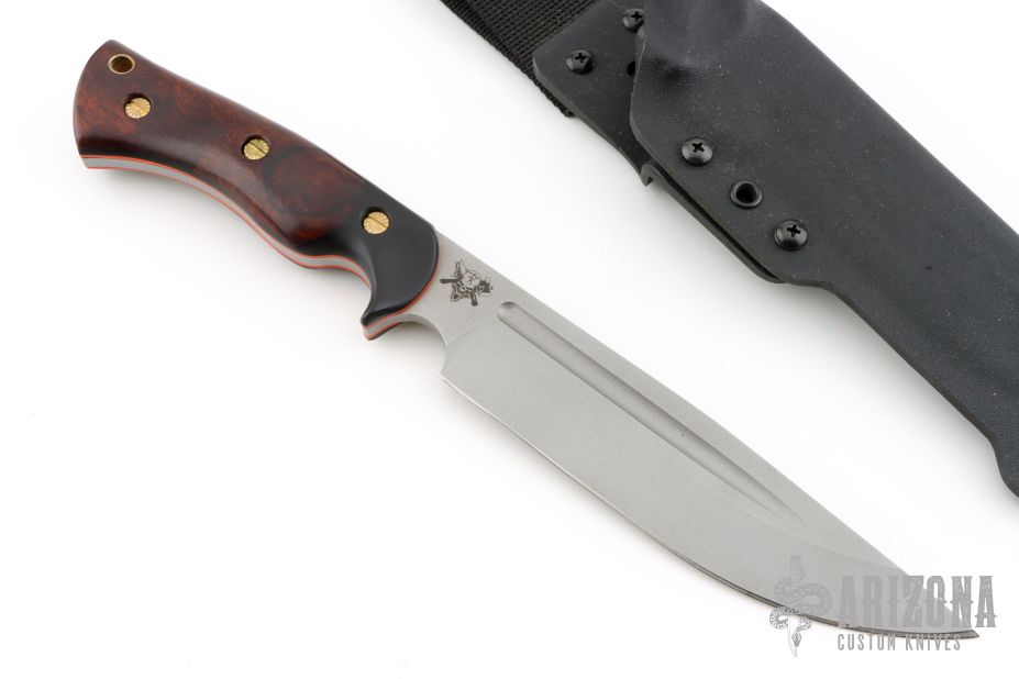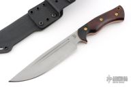 This Honey Badger by Dark Timber Knives features a matte finished blade with fullers, .192" blade stock and 1.535" blade depth, full tang construction. The handle has black linen micarta bolsters, desert ironwood scales with orange G-10 liners. Comes with a kydex sheath with belt loop, and original box. Excellent condition.