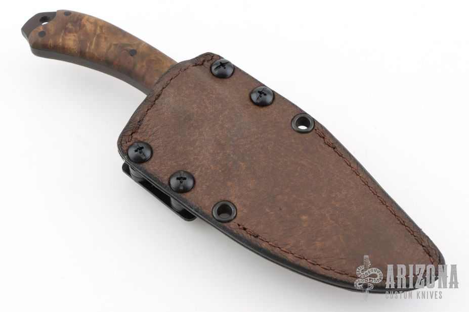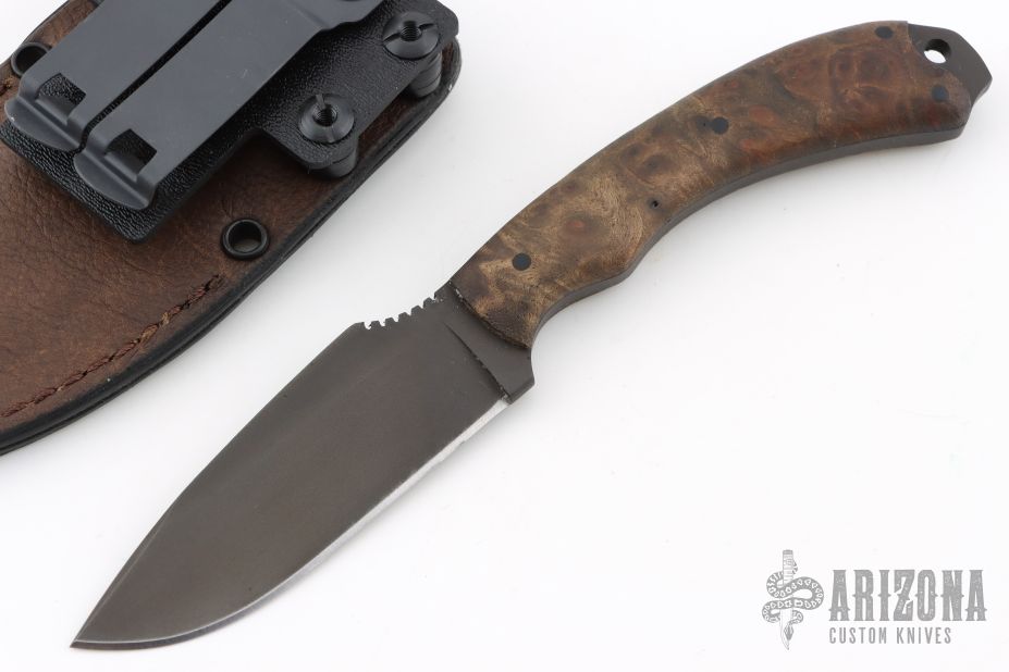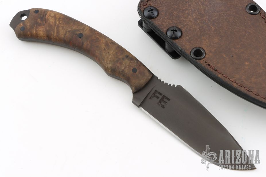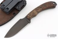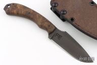Field Ethos Sweet T by Winkler Knives. Black blade with notched thumbrest, .178" blade stock and 1.170" blade depth, full tang construction. The handle has pinned maple burl scales with lanyard hole. Comes with original box, papers, and leather/kydex sheath. Has a couple light scuffs, excellent condition.