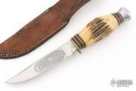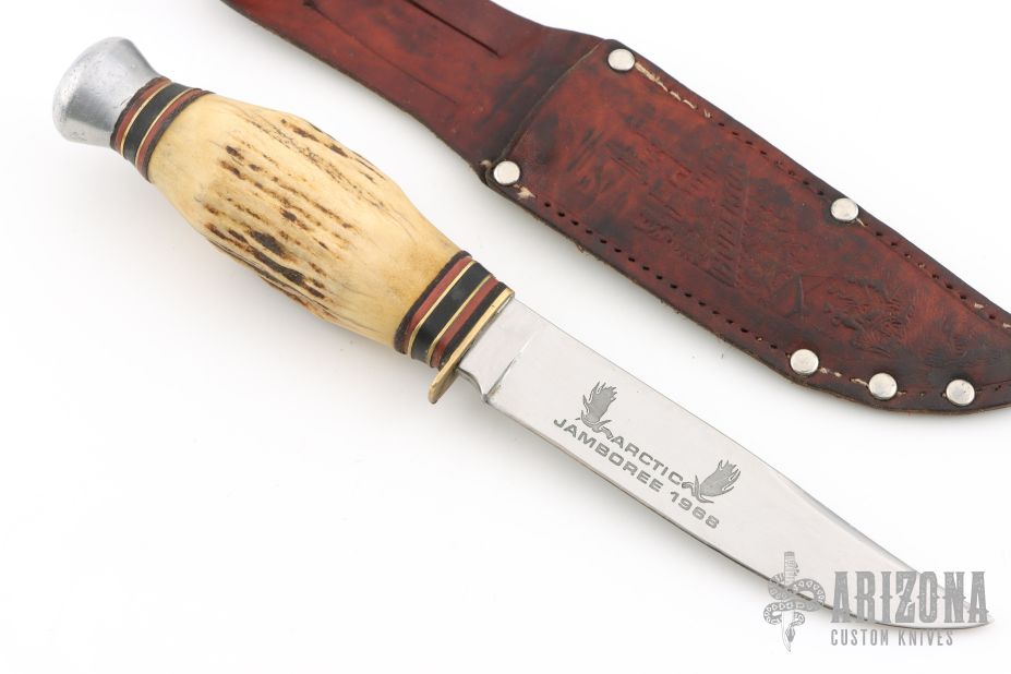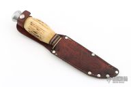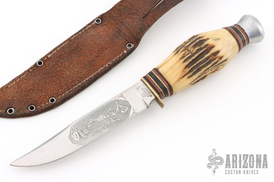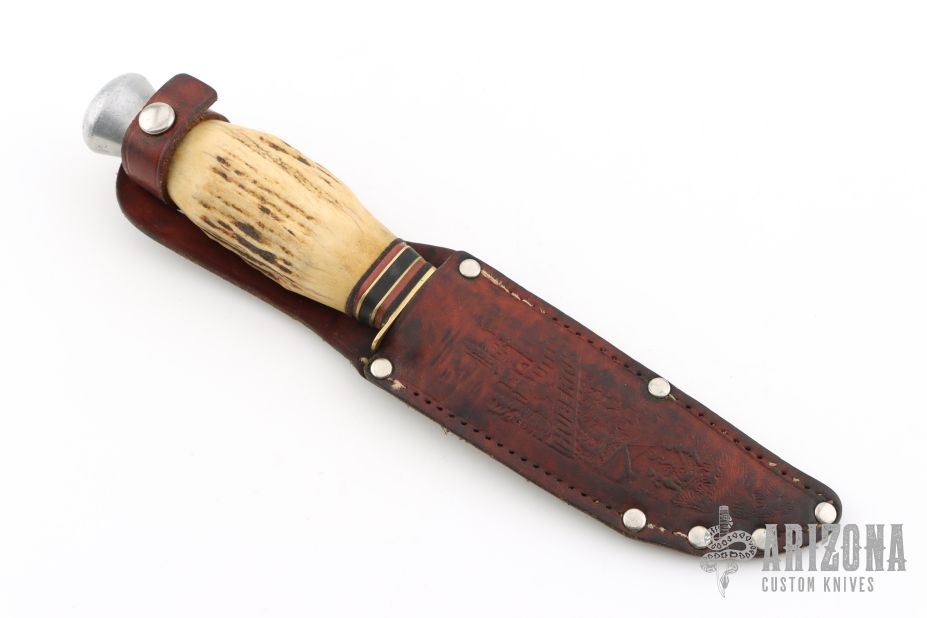 The knife by Hubertus features a satin finished blade with false top edge, .185" blade stock and .882" blade depth, hidden tang construction. The handle has a brass guard and aluminum butt, stag grip, black/red/brass spacers. Comes with a brown leather sheath. Has light scratches, otherwise good condition.
