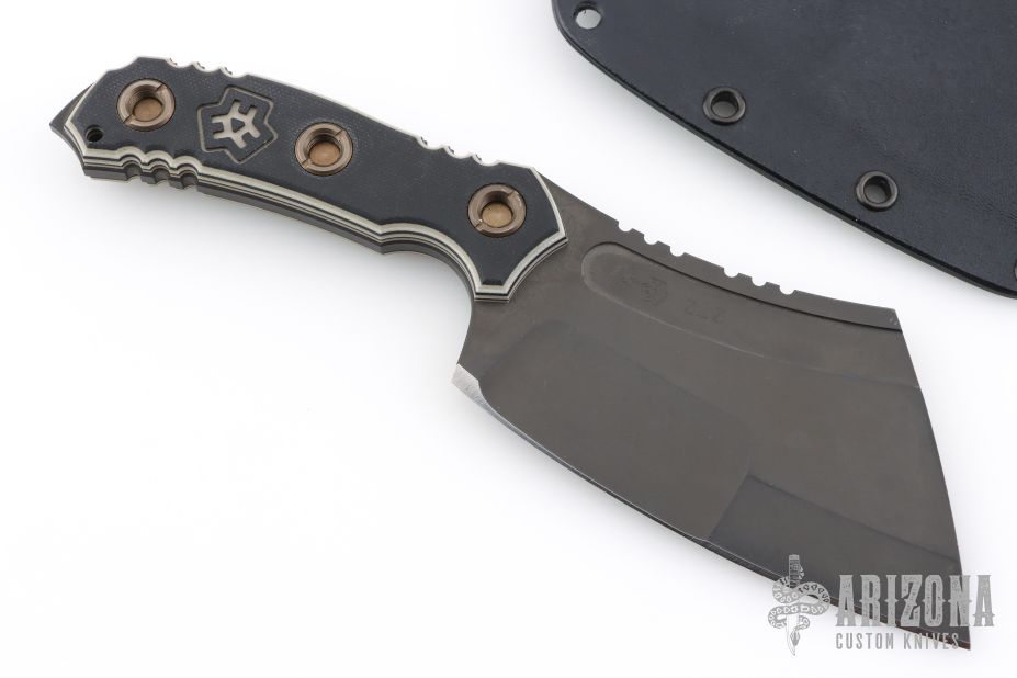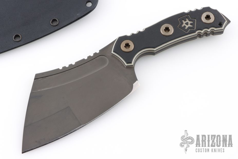This American Kami and EraTrh3 Cleaver Collaboration feautres a black blade with fullers and notched thumbrest, .189" blade stock and 2.645" blade depth, full tang construction with G-10 scales. Comes with a kydex sheath and a burlap pouch. #010. Has a couple light scuffs, otherwise Excellent condition.