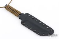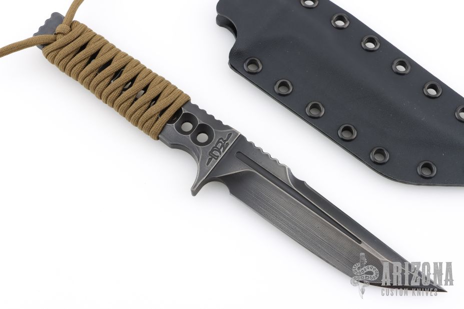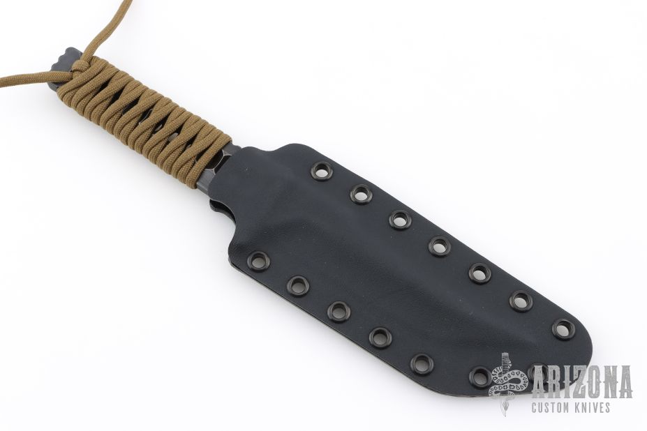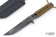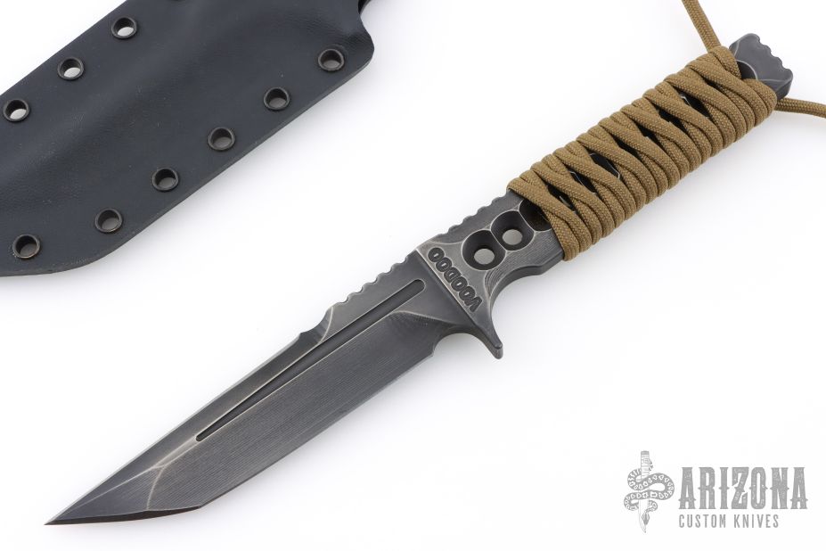 This Custom Voodoo Tanto by ZU Bladeworxs features a black satin blade with a top edge, .258" blade stock and 1.122" blade depth, integral construction with notched tang and hole pattern in handle. The handle is cord wrapped. Comes with a kydex sheath. Excellent condition.